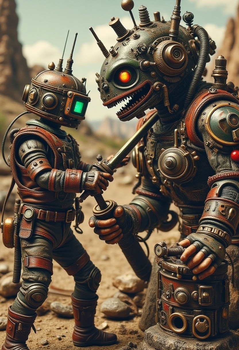 Savage barbarian warrior holding a sword wearing leather fighting a post-apocalypse steampunk gear-powered android, wasteland background, correct digits, perfect expressive eyes, perfect pupils, otherworldly, interesting color pallet, Stunning visuals, Texture, beautiful face features, YFG-LBGadgets