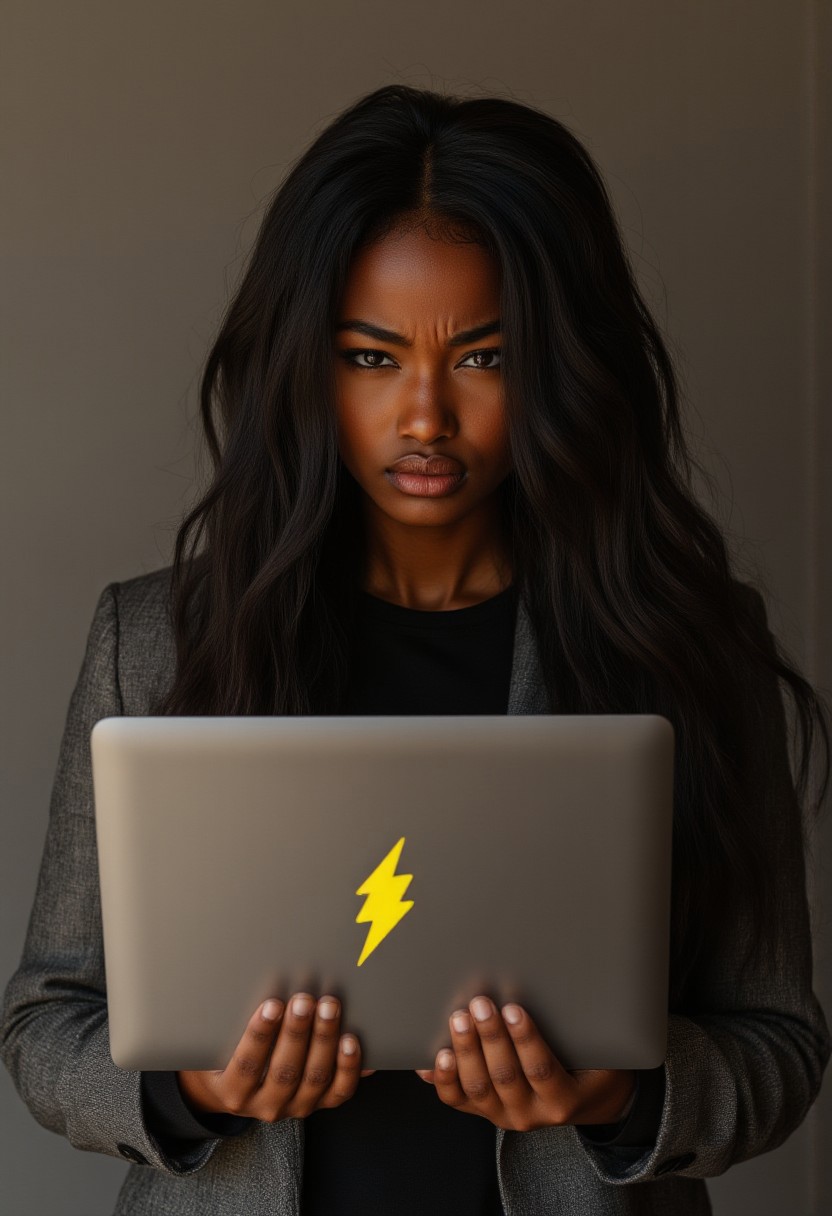 black girl FictionalAbby holding a laptop with a yellow lightningbolt symbol and the number 0 next to it on the screen