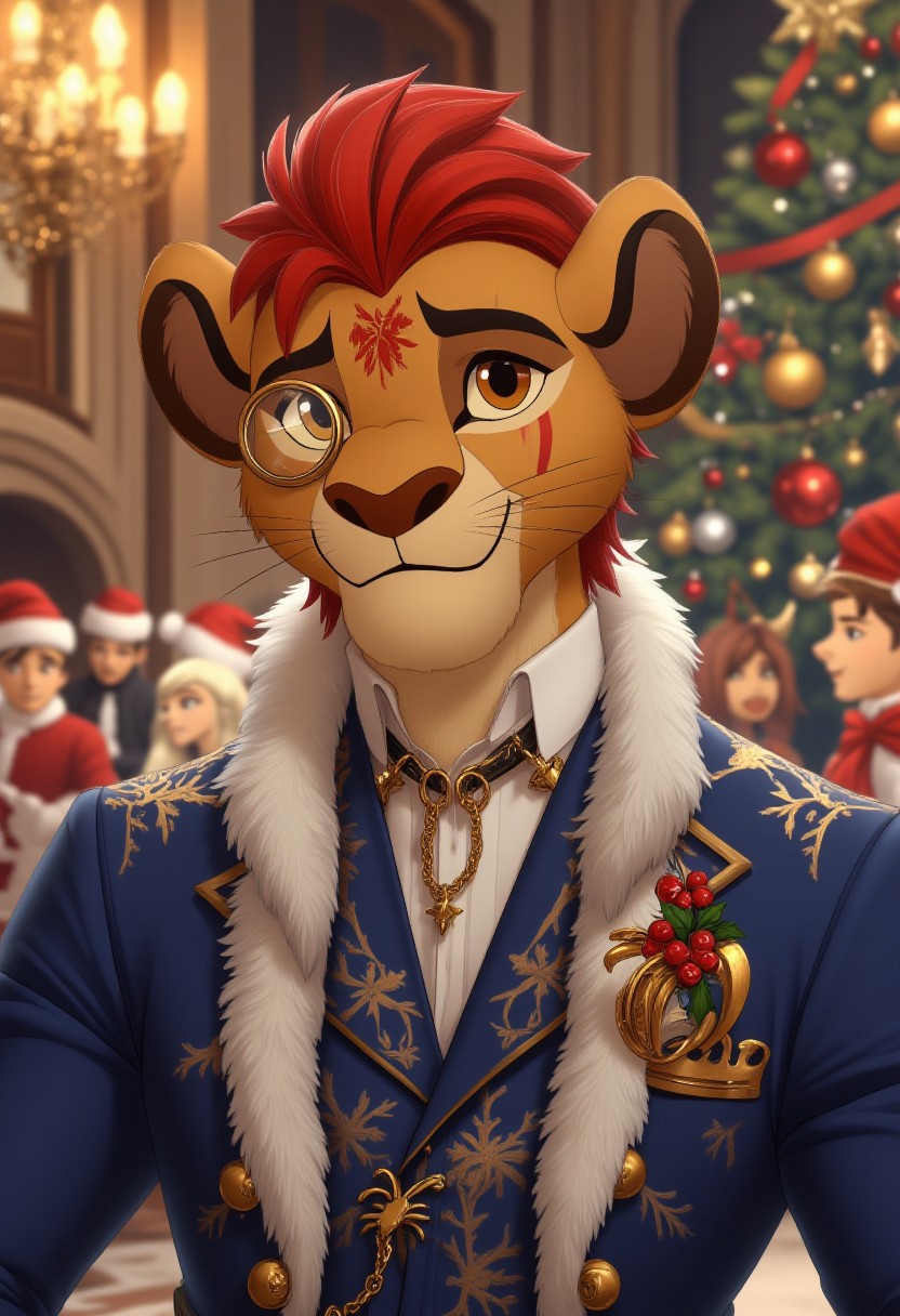 Illustrated picture of handsome antropomorphic lion boy (((Kion))) with red hair and brown eyes and a scar over the left eye. Kion is wearing an outfit with blue and gold smoking trimmed in white fur. The design features snowflake motifs etched into the smoking and a crown with poinsettia and holly details. On his right eye is a monocle with a gold rim and a gold chain leading to the chest pocket of his jacket, which adds to his seriousness and elegance. He seems amused at a fantasy dance ball in christmas decorated hall.