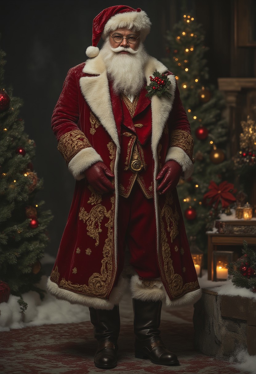 Realistic image reimagines a tall Santa Claus with a fashionable Victorian aesthetic. He dons an elegantly tailored deep red frock coat with intricate gold embroidery, a luxurious fur-lined collar, and polished leather boots. His fancy moustache is carefully groomed, paired with round, vintage spectacles. A velvet waistcoat and pocket watch add a refined touch, while snowy flakes swirl around him, enhancing the nostalgic yet stylish, aristocratic vibe. His confident, dignified pose exudes timeless charm, vantablack