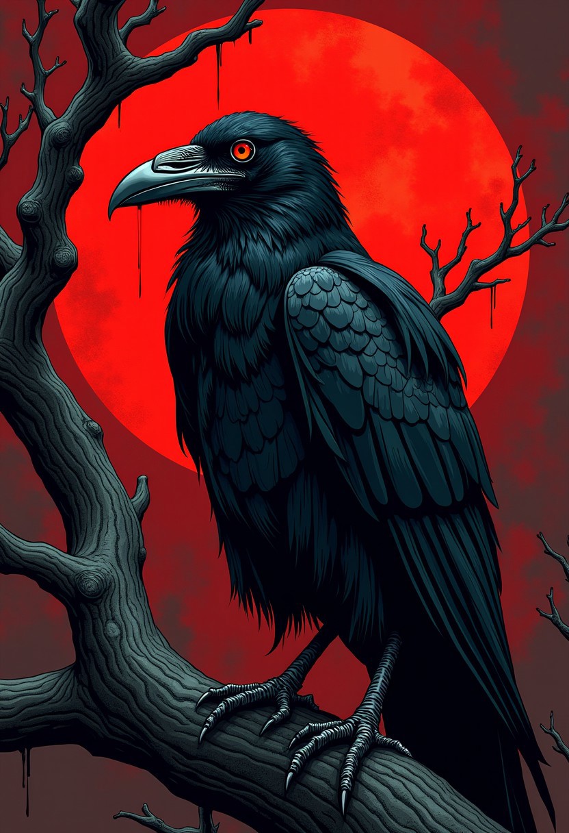 A large, ominous raven with piercing red eyes perched on a gnarled, dark tree branch against a blood-red moon. Detailed, intricate line work outlines the raven's dark plumage and the skeletal, almost demonic branches, creating a dramatic, gothic atmosphere. The red moon casts deep shadows and highlights the texture of the branches. Dark, deep shades of black and red dominate the scene. The raven's posture suggests stillness and watchful anticipation, with a strong sense of foreboding. A detailed, highly stylized illustration, reminiscent of dark fantasy art, with heavy emphasis on line and form. Crimson blood-like splatter adds a sense of menace. Full-frame, detailed image, with no discernible human elements.