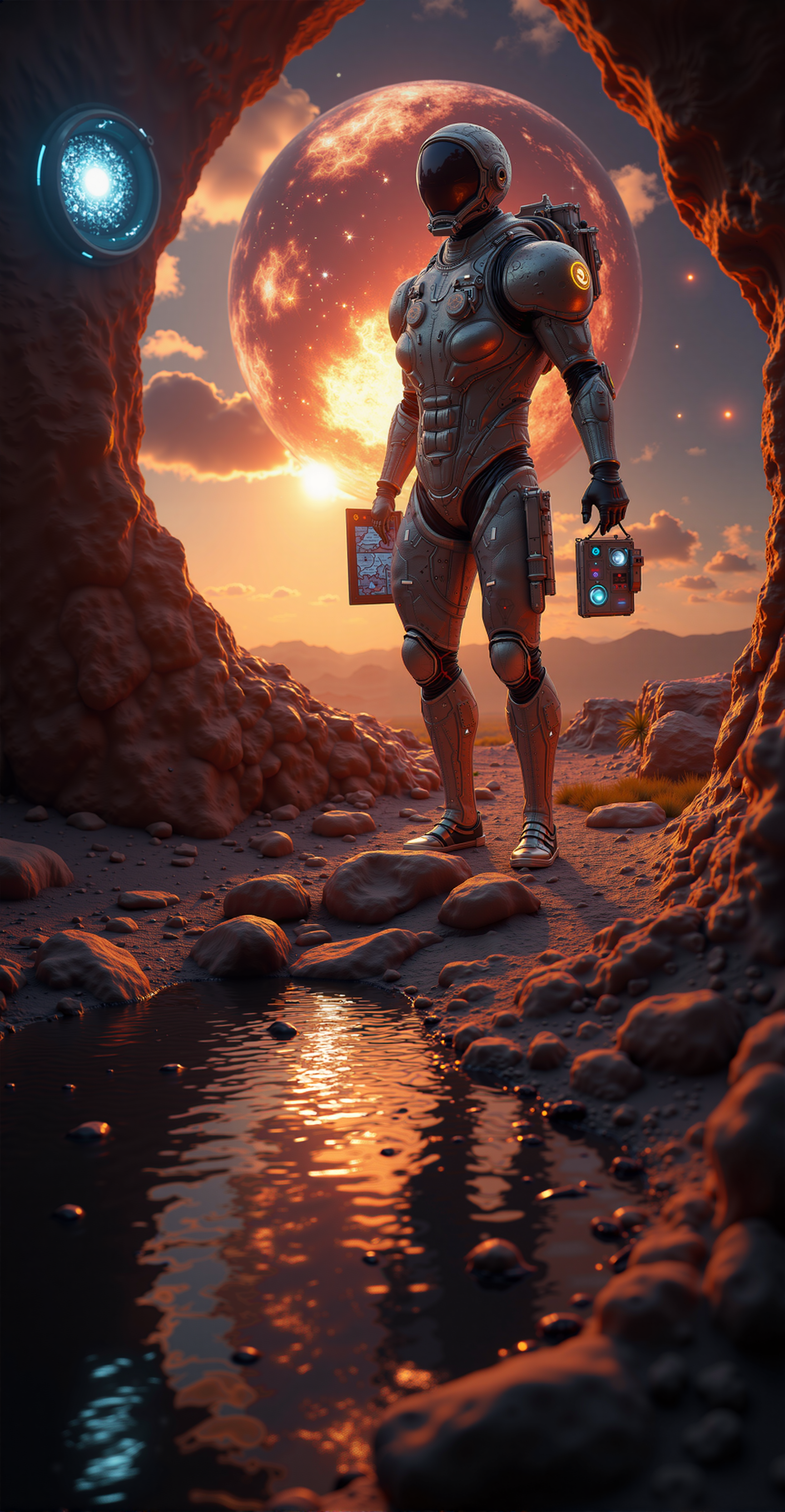 A Hyper-Realistic Space Style of, A dying star's fiery core crackles at the edge of a time dilation field, where seconds tick by at a glacial pace. Amidst the swirling plasma shield, a lone figure emerges from crystal caverns on a moon, their suit glowing with smoky silver luminescence. In hand, they hold a holographic map, etched with nebula gas trails that seem to pulse with life. The dusky bronze landscape stretches out before them, a testament to the universe's fleeting beauty., aidmareduxstyle