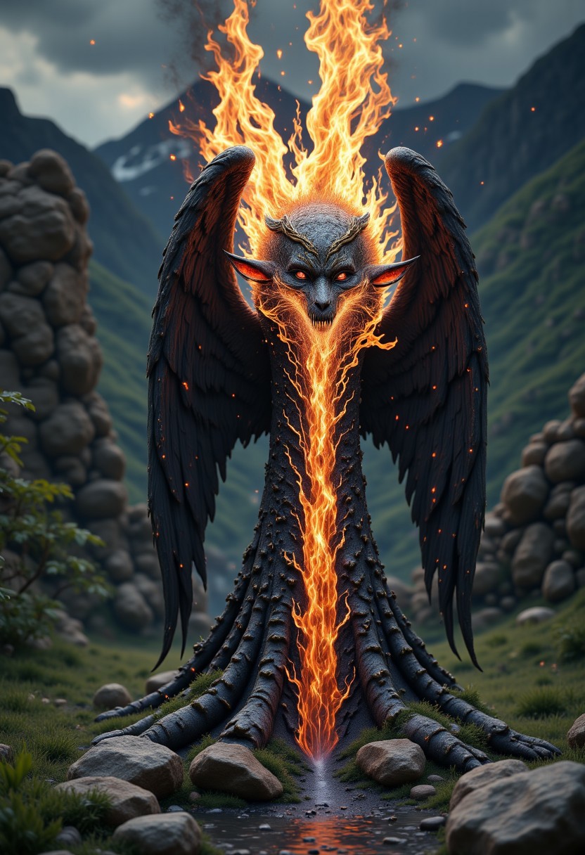 aidmareduxstyle, Slow Shutter Speed shot of a [Burning|Icy] ("The Angel Statue - Azurune of Mana":1.1) , Spring, Lord of the Rings, Post-Apocalyptic Art aidmaMJ6.1, aidmafluxpro1.1