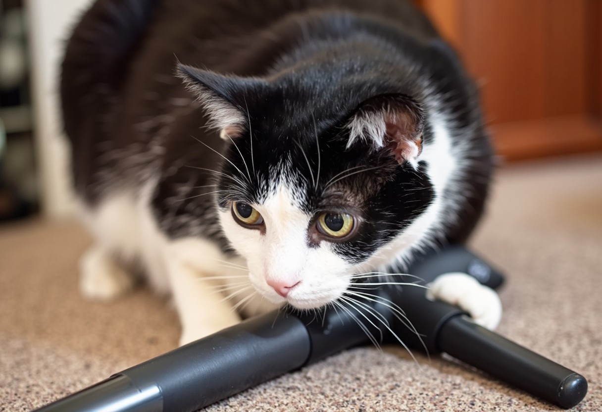 Photograph of Berkeley Cat, a black and white cat. Its looking suspiciously at a vaccuum.