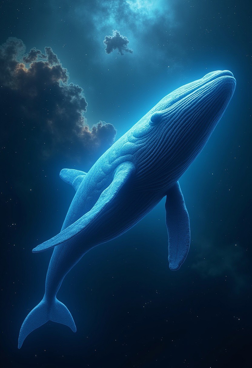 A titanic whale glides majestically through the cosmos, its glimmering blue skin shimmering with bioluminescent patterns that echo oceanic depths. Solar winds ripple through translucent fins, propelling it past luminous nebulae. Ethereal currents swirl around, carrying a sense of serenity and power. A living, breathing guardian of aquatic mysteries, adrift among the stars.