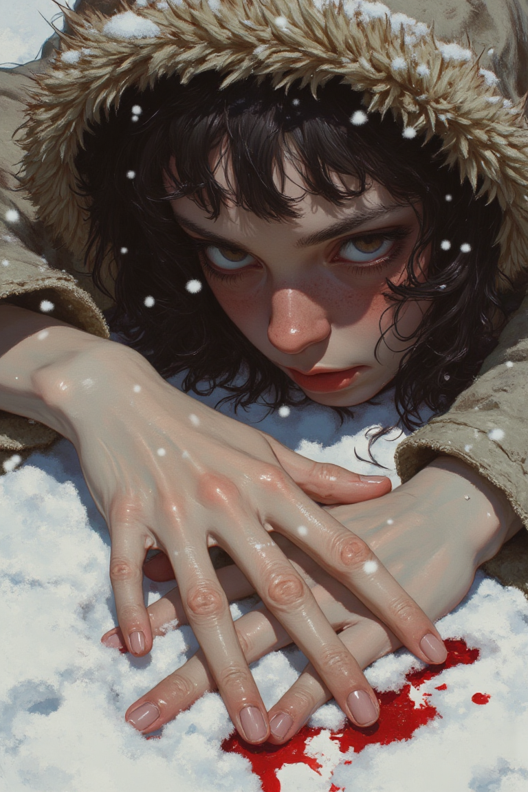 A hyper-realistic composition of a woman laying on her side in thick snow, her tan complexion stark against the wintry white, her expression stoic and unmoving. Snowflakes cling to her long, curly dark hair and the fur trim of her hooded cloak, which is torn and dusted with frost. Blood trickles from her fingers, staining the snow in small, vivid red pools that trail away from her hand. The lighting is soft and uniform, creating a somber and muted atmosphere as the snowfall continues to veil her figure, blending her into the endless white surroundings.