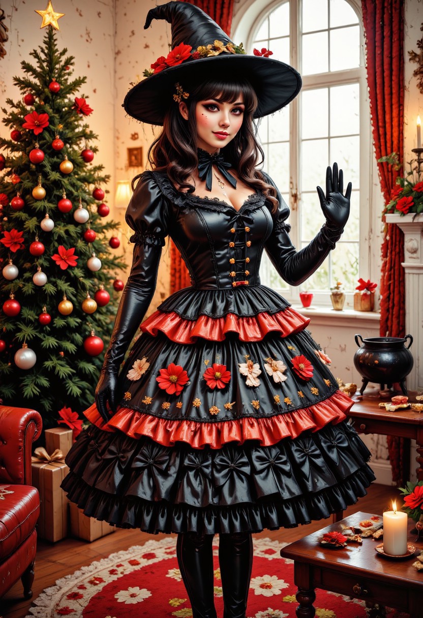 Professional cinematic highly detailed, CGI-rendered digital artwork depicting a beautiful witch wearing glossy frilly padded latex Christmas dress decorated with many bows and frills. Her long straight dark hair is decorated with many bows and witch themed accessories and she is wearing a large pointy witch hat. She is also wearing long latex gloves and waving at the viewer. She is standing next to a cauldron in a christmas living room. sweetegl, sweetop, swe3tjsk, bl0use, witch, (latex:1.2), gothic, Christmas, glossy, shiny gleaming oily fabric, christmas living room, witch cauldron, dark fantasy, evil grin, crazy eyes, cowboy shot, (sfw), (shiny glossy latex clothing, gleaming oily latex fabric:1.1)