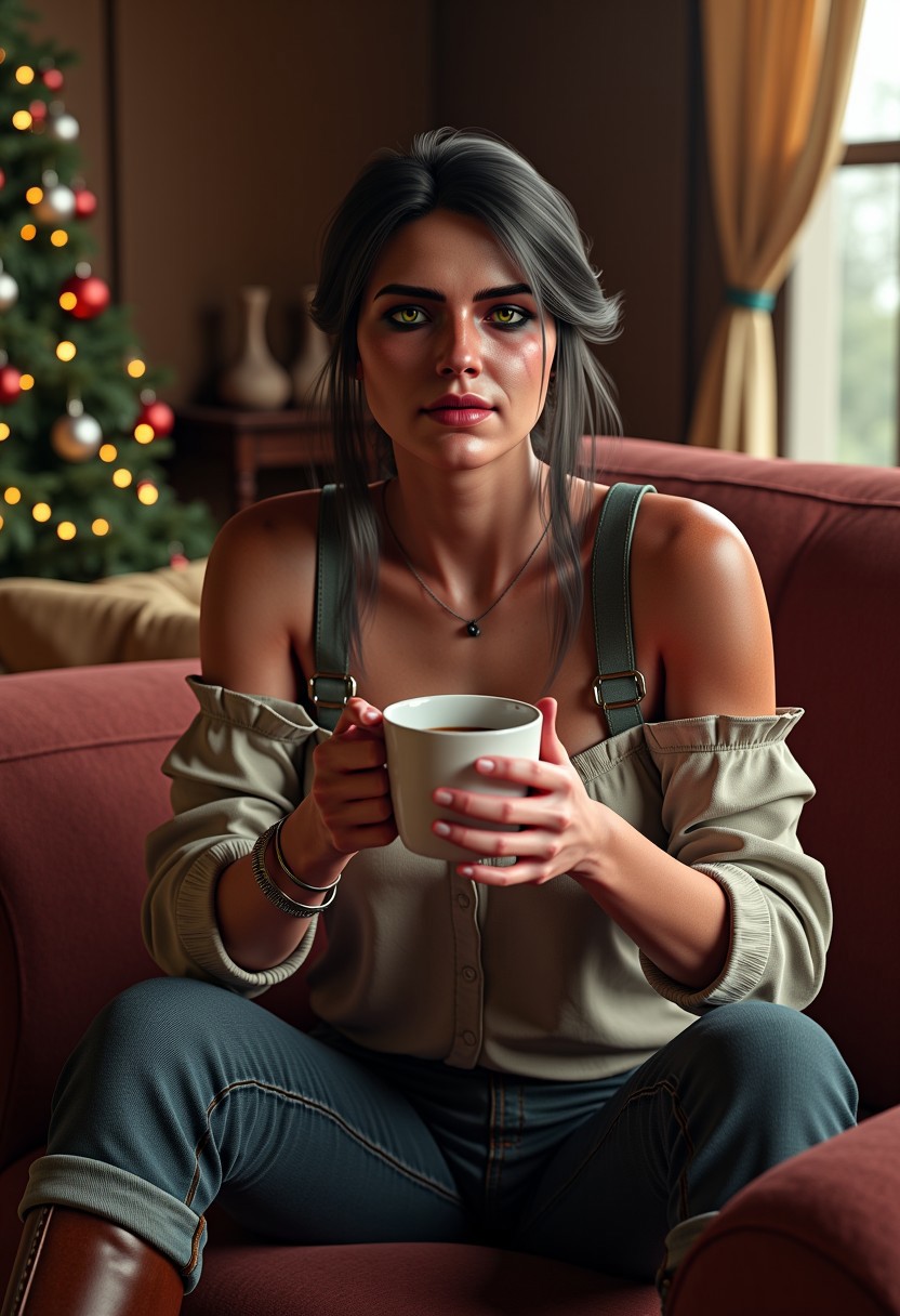 A photorealistic cowboy shot of Ciri holding a cup of hot chocolate seated on a sofa. The backdrop is christmas living room