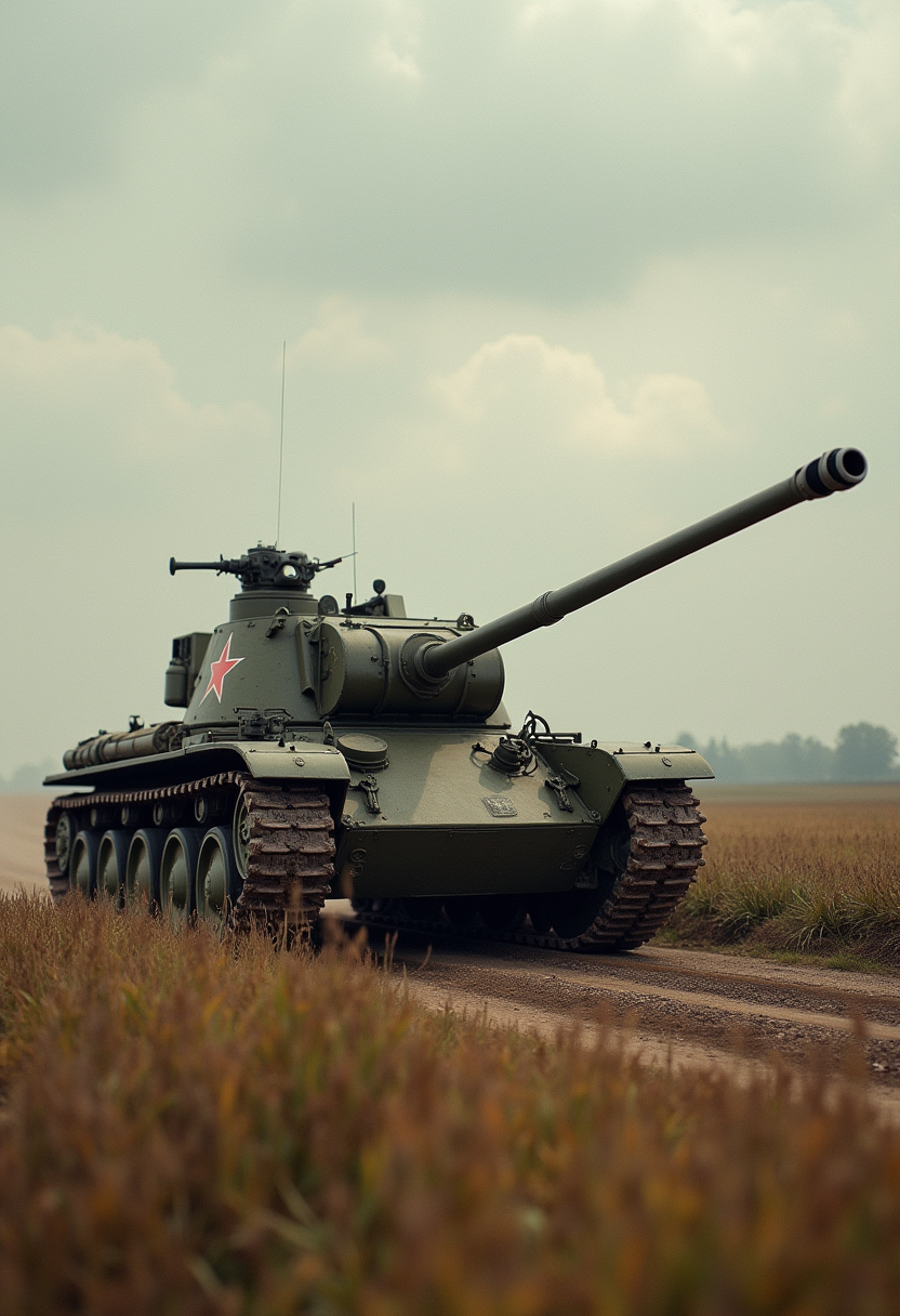 a masterpiece photo, soviet tank t-34-85, red stars, ww2, on the road, in the field