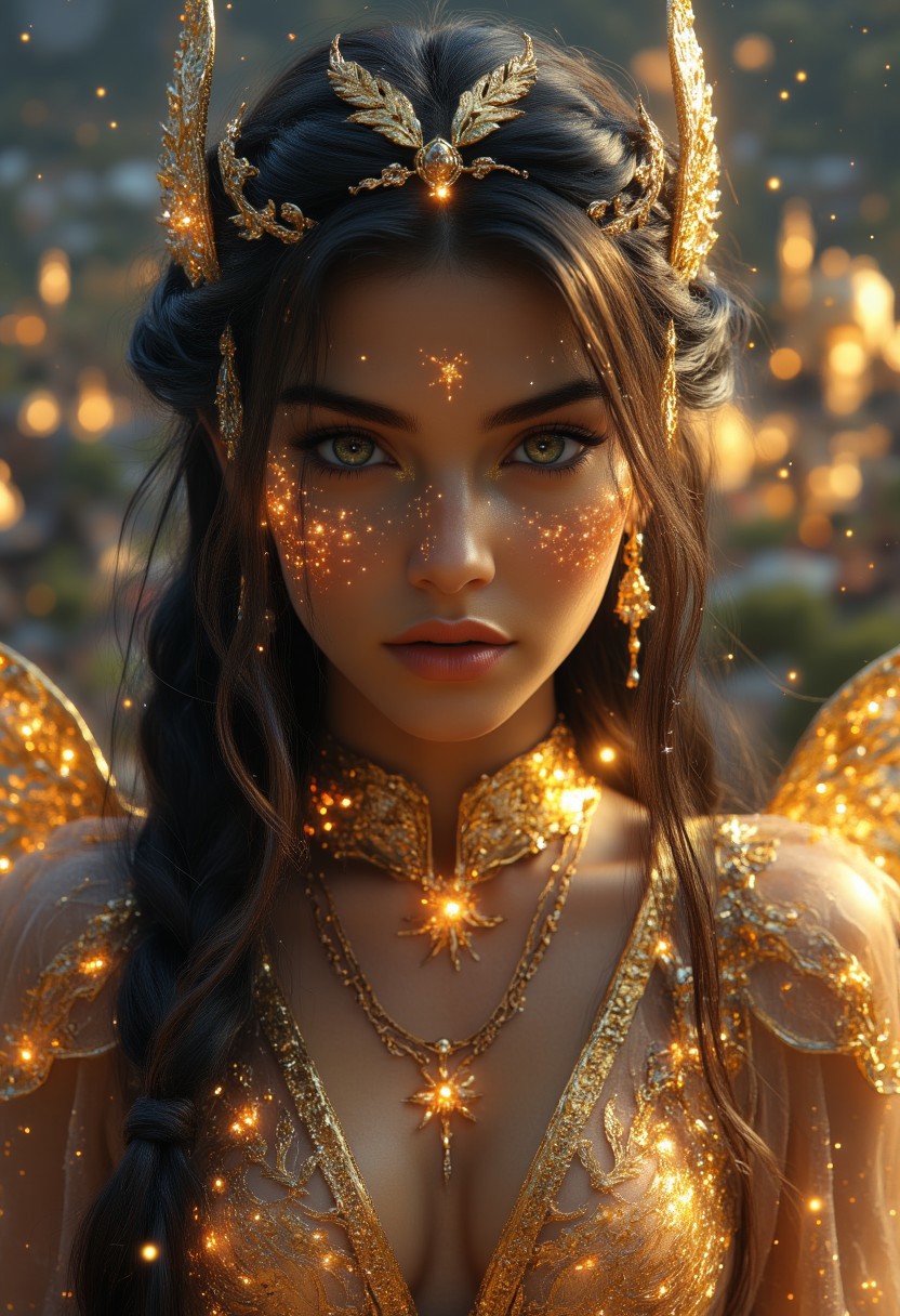 A wonderful Golden fantasy, a hyper-realistic of a golden woman with glowing skin that shimmers with the colors of gold, the whole body is decorated with intricate golden patterns and celestial stars. Her body is marked with luminescent stripes that pulsate faintly, creating a mystical aura. The girl sits on a mountain, and looks at the viewer from top to bottom, view from below. At first glance, the girl has a beautiful figure, elegant and fabulous grace, the long dress shimmers with gold like liquid metal. She has golden feather wings on her back, each feather is golden in color. Her black eyes are framed by golden makeup. Black soft lips resemble metal. She wears a billowing golden transparent robe made of fabric that looks like stardust, and her long, straight black hair cascades down like a starry night, swirling in blue and gold. In the background are golden buildings on a mountain, and soft rays of light illuminate the girlish divine form. The image is framed in a cinematic close-up to capture the intricate details of her gold ornaments.