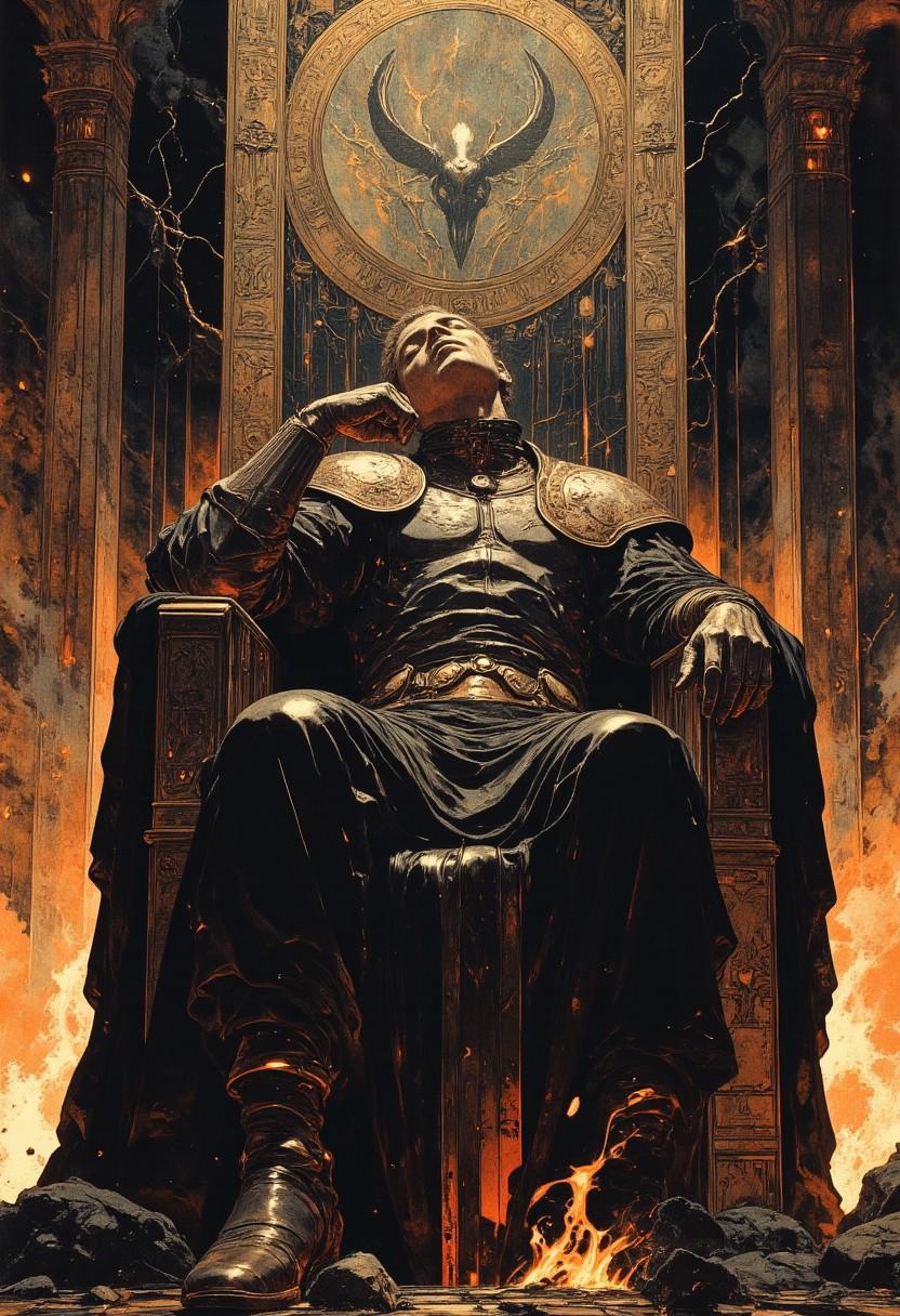 Portrait of a queen-like figure seated in a relaxed, commanding pose atop a throne, The character leans back with one leg draped over the arm of the throne, with a sheathed sword resting on his lap, exuding an air of dominance and confidence. His head tilts slightly, resting on a fist, with an intense yet amused expression. The character wears dark, ornate armor adorned with crimson accents and a mantle of shadows cascading over the back of the throne. The dynamic lighting highlights the texture of the throne. The background reveals a cavernous hall with towering stone walls etched with glowing runes, flickering torches, and cascading shadows, reinforcing the atmosphere of dark fantasy royalty.