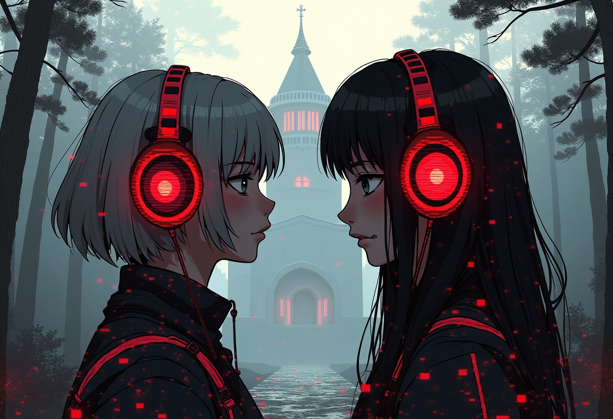 two anime girls with cyberpunk headphones stand in front of an ancient castle, glitch art style, digital glitching and pixelation, forest background, wide shot, game concept art, digital painting, fantasy setting, digital illustration, by Akihiko Yoshida Nunamiids logo, glitchy black red white color scheme, inspired by the world war one art style, two people are shown in profile view. The left girl has short hair, while on right is long-haired woman. They both have ear piercings. Their eyes appear to be gray or blue.