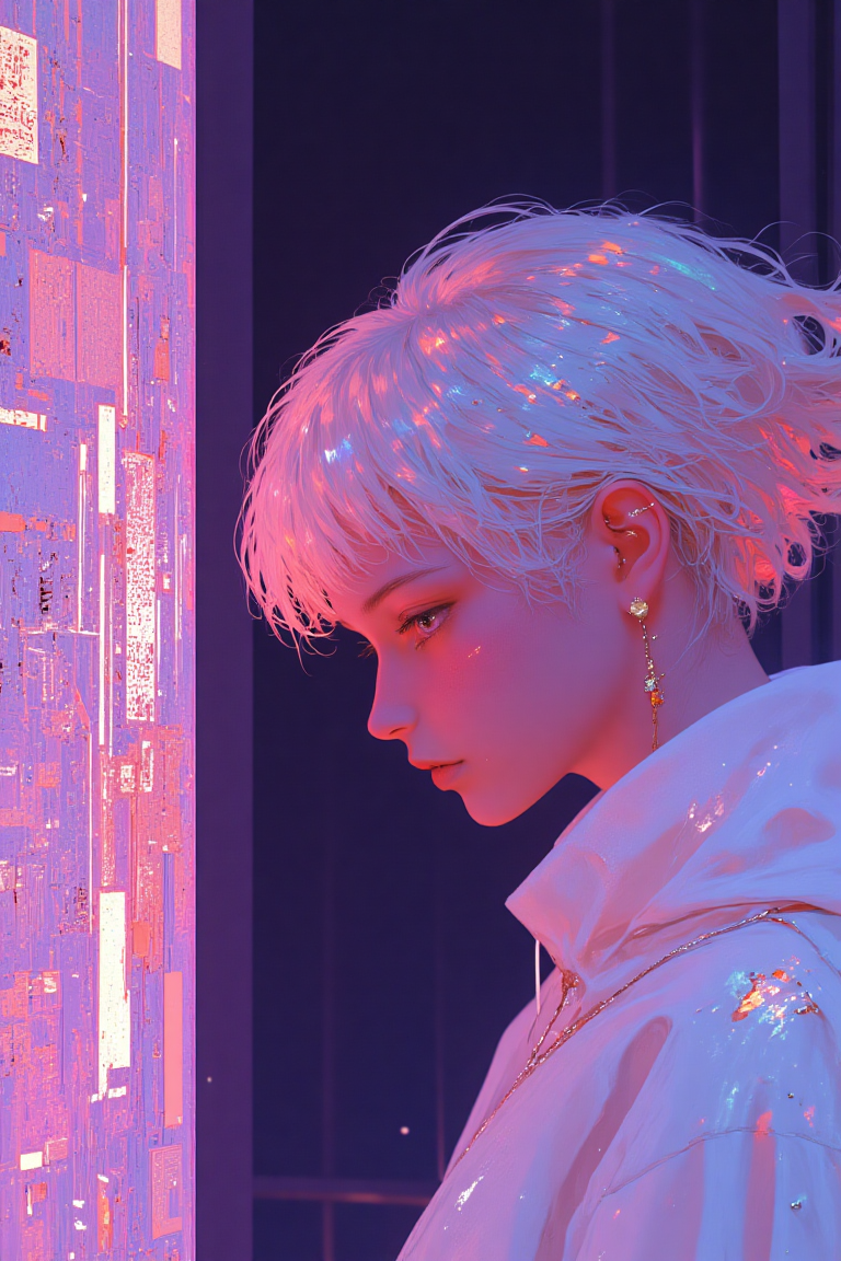 Transcendent Cyber Empress: A close-up portrait of a pale-skinned woman with a high-tech pixie cut, the short strands expertly styled to give her a bold, futuristic look. Her sharp, angular features are softened by the intricate curtain that partially obscures her face. The curtain is covered in glowing neon circuit patterns, in shades of vibrant pinks and purples, with gleaming, sparkling accents that resemble digital code. The luminous patterns shift and pulse as if alive, adding an aura of energy to the composition. The cool violet background reflects the electric nature of the glowing curtain, intensifying the futuristic vibe. The curtain subtly covers her cheek, leaving only the intensity of her eyes and the gleaming details of the pattern visible. High quality rendering, 8K.