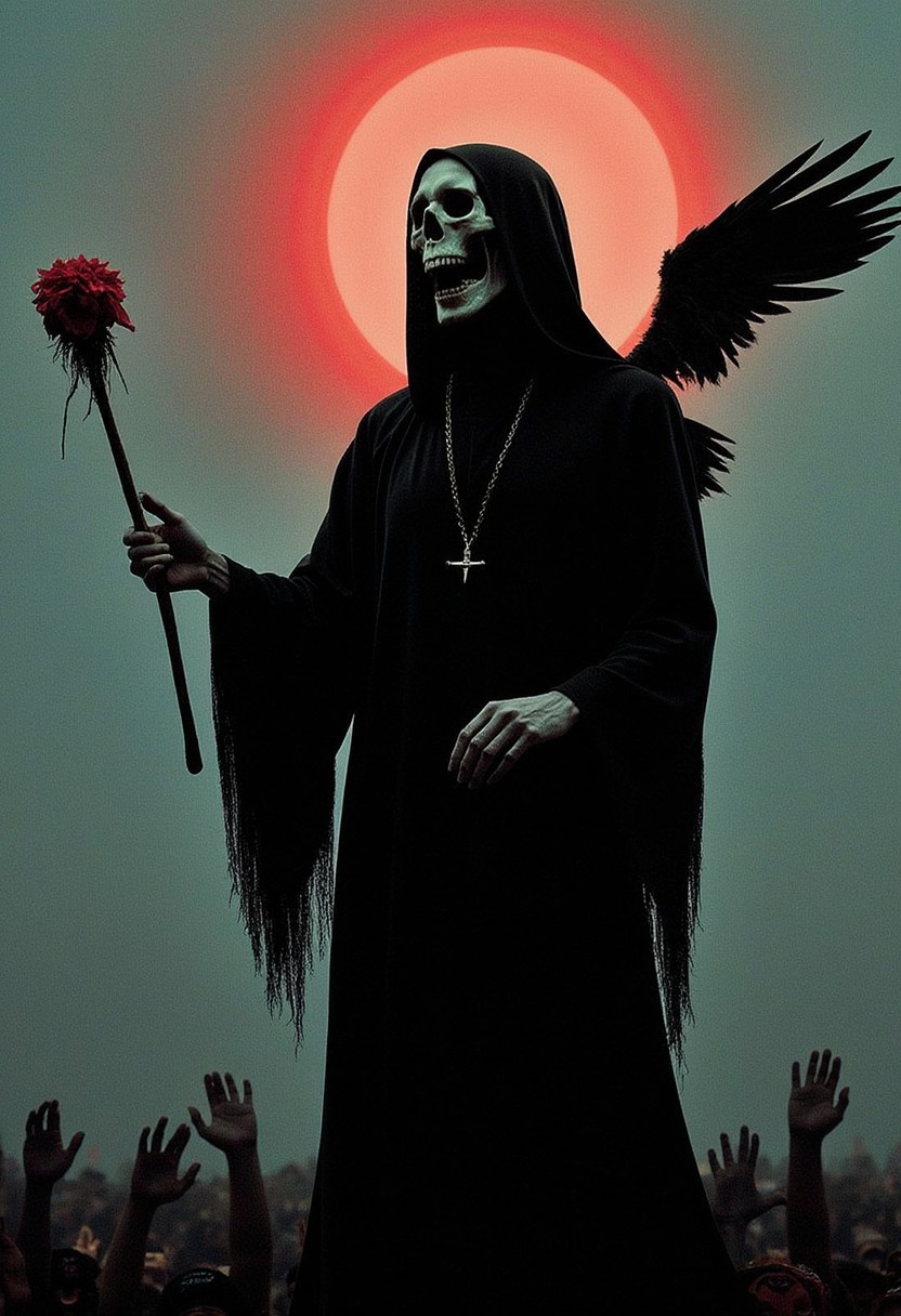 spectral glow, chromatic grain, Ghastly light, chromatic aberration, a towering skeletal figure robed in midnight black, orchestrating a symphony of screams with a wand of raven feathers, as shadows dance to his haunting melody.