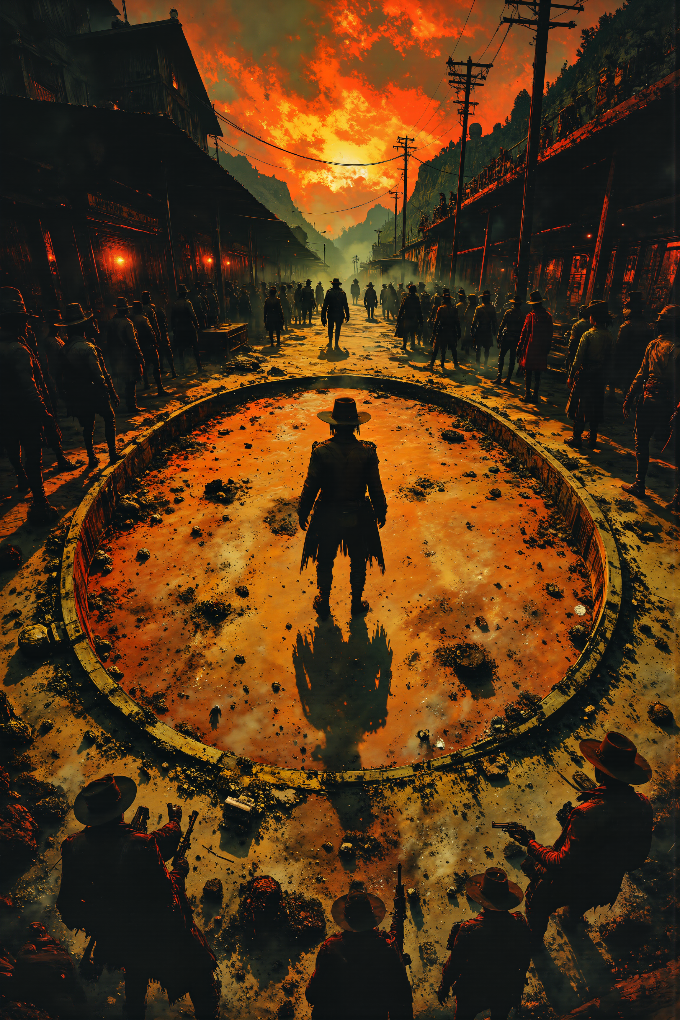 A dramatic birdâs-eye view of the Redemption Gulch town square, where a circular dueling arena made of trampled dust and discarded bullet casings stands under the midday sun. Around the edges of the square, a crowd of diverse and shadowy gunslingersâeach unique in style, from fancy sharpshooters to rugged outlawsâwatches intently. One figure, a lone contestant with a battered hat and long duster coat, stands in the center with his back to the viewer, poised for action. Above, the blazing sun glares down, casting sharp, dramatic shadows <lora:midjourney_whisper_flux_lora_v01:0.55><lora:aidmaMJ6.1-FLUX-V0.1:0.4><lora:FluxMythP0rtr4itStyle:0.4><lora:detailed_flux_ntc:2.2><lora:aidmaImageUpgrader-FLUX-V0.1:0.65><lora:Luminous_Shadowscape-000016:0.8>