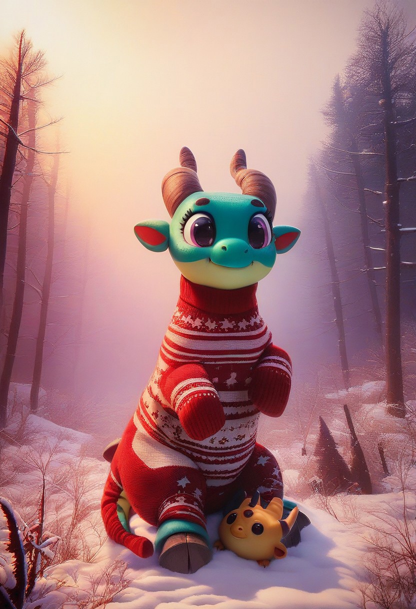 score_9, score_8_up, score_7_up, score_6_up, score_5_up, score_4_up, (((award winning photo))) extreme detail, highly detailed, photo realistic, dynamic lighting, godrays, a baby dragon, animal, cute animal, wearing a colorful christmas_sweater, baby dragon in a christmas sweater, cute baby dragon sitting on a hill, outdoors, christmas woods, forest, snow, (sharp focus:1.2),DOF,(masterpiece, best quality),(sharp focus:1.2),(photorealistic),(intricate details),unity 8k wallpaper,ultra detailed,
