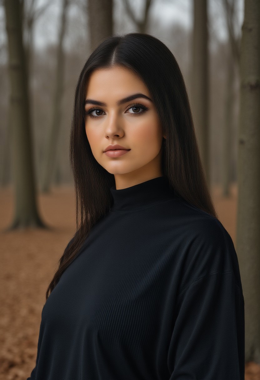 lora:Mia_Radić__-_Flux_Model:1> 20 year old woman in the woods modeling, moody portrait, realistic, high quality photo