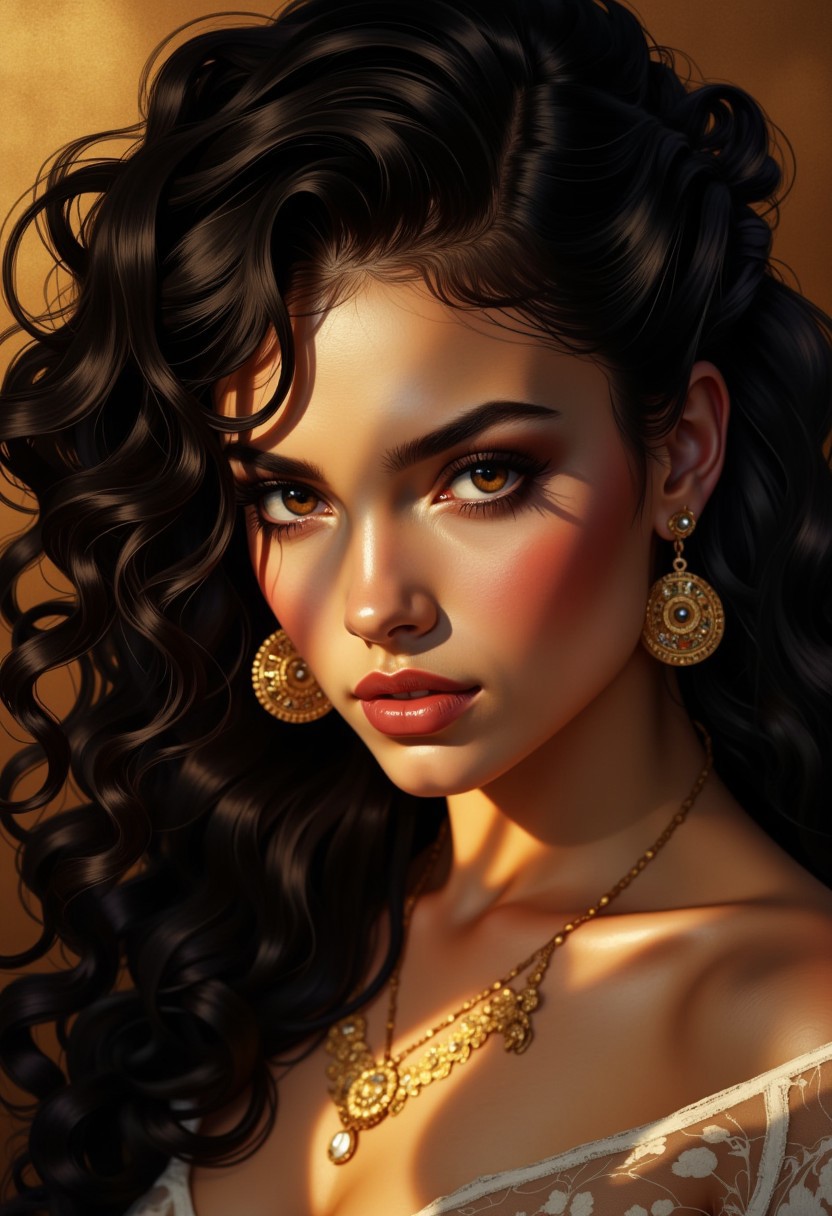 Photo, portrait of a stunning woman with long curly dark hair, intricate, elegant, highly detailed, sophisticated, anime art by Loish and Ilya Kuvshinov. Golden earrings and necklace, intense gaze, masterpiece, warm and dramatic lighting, finely detailed piercing eyes, hdr, hyper-realistic, high definition