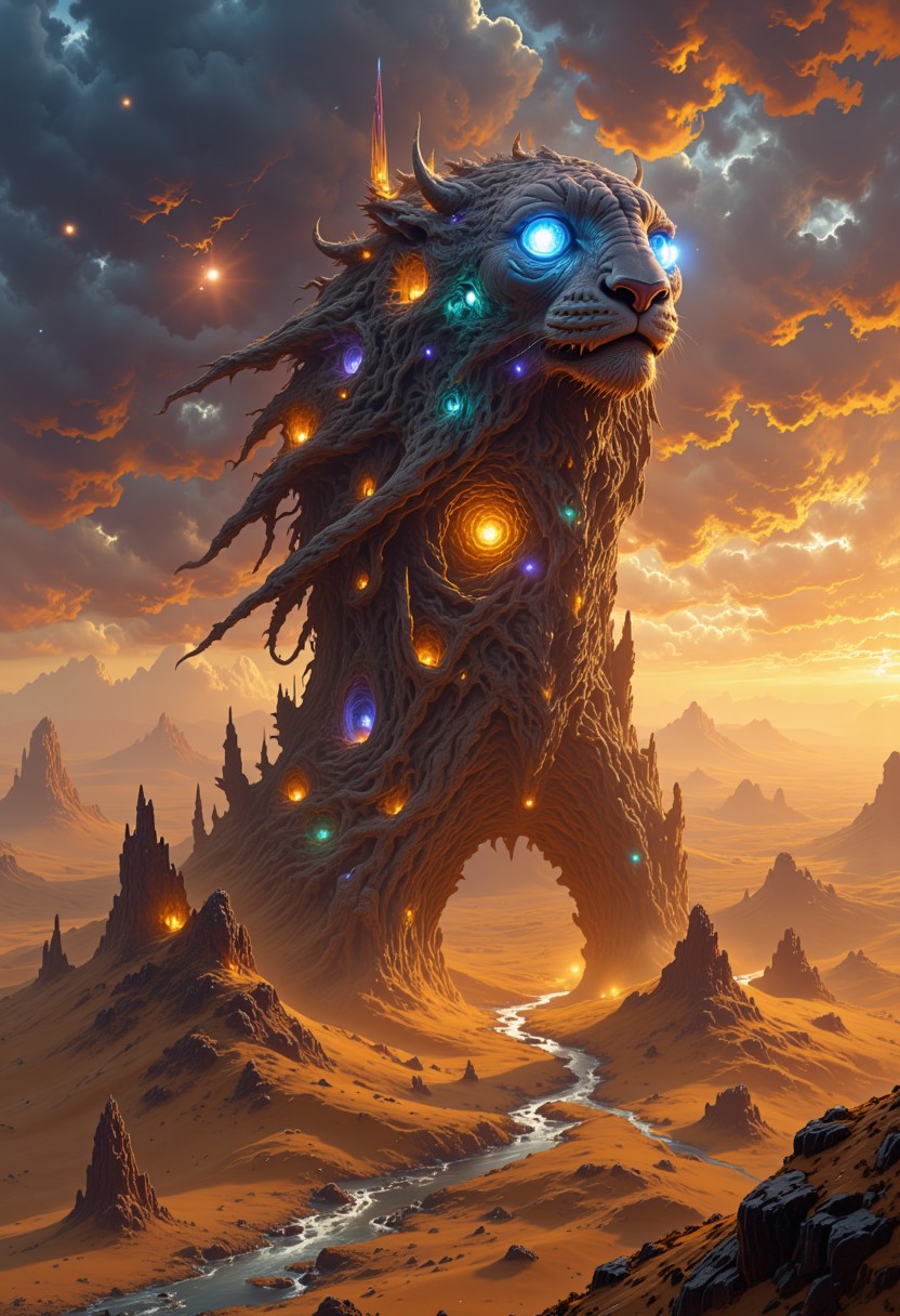 in the style of ck-ovf, Dans un désert infini, un gigantesque roi humanoïde composé de sable mouvant s'élève comme une montagne vivante. Son corps est en perpétuelle transformation, tourbillonnant lentement en vortex, avec des dunes et des vagues de sable scintillant sous la lumière de deux soleils jumeaux, qui forment ses yeux incandescents. Le long de son torse et de ses bras colossaux, de minuscules villes en pierre précieuse et en métal doré sont incrustées dans sa structure mouvante, illuminées par de petites torches et lanternes suspendues. Des tempêtes de sable miniatures gravitent autour de lui, comme des satellites naturels, tandis que de mystérieux habitants minuscules – des êtres de cristal lumineux – s’activent à bâtir et à reconstruire ces cités qui disparaissent au gré de ses mouvements. À chacun de ses pas, le sol se transforme : des oasis jaillissent soudainement, avec des rivières d'eau liquide dorée, des plantes aux pétales translucides et phosphorescents, et des arbres dont les feuilles sont faites de soie irisée. Les vents portent un murmure ancien, comme un chant profond et mélancolique, tandis que des silhouettes célestes flottent dans le ciel rougeoyant, observant cette créature légendaire qui façonne le désert à chaque instant.