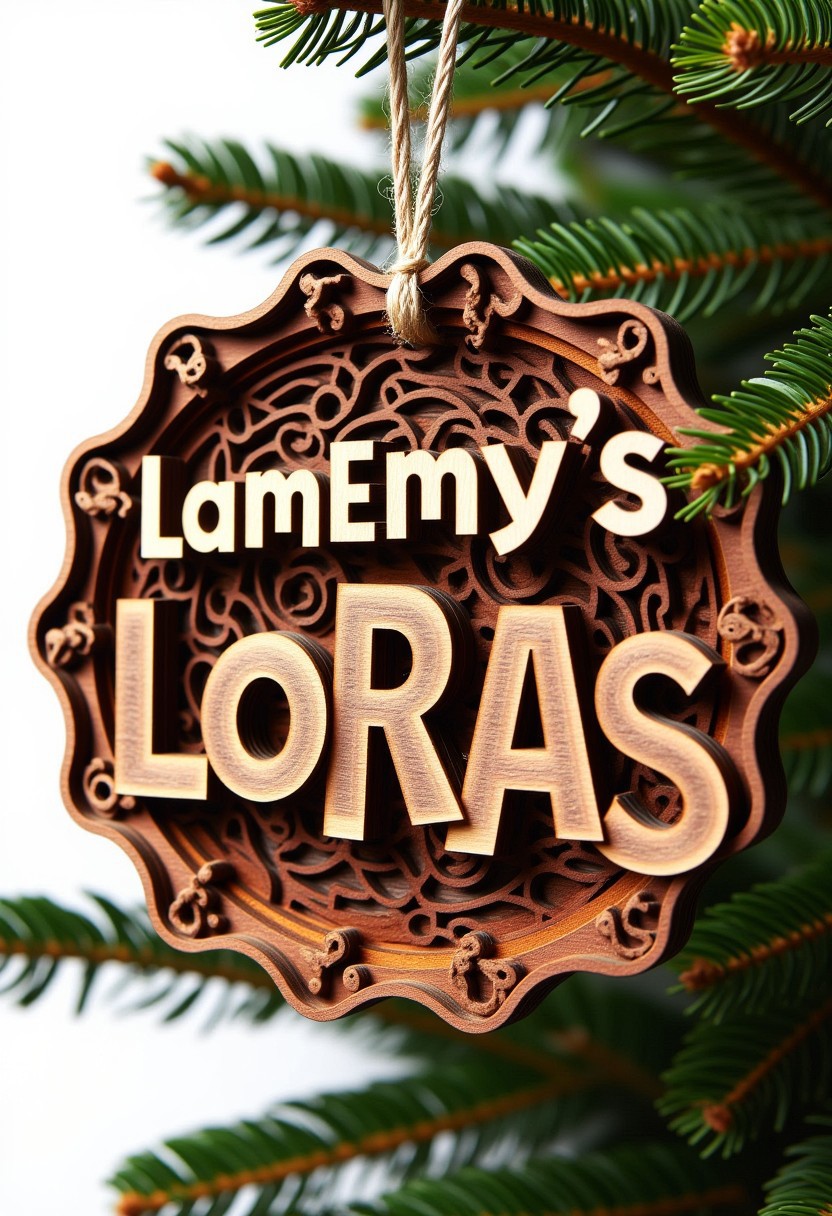 Photograph of a festive, whimsical, handmade Christmas decoration, created using basic crafting supplies, hanging on a Christmas tree. The Christmas ornament is laser cut, layered wood. Create the words 'LamEmy's LoRAs' in a fully layered woodcut art style, where the entire image, including the background, is composed of intricately layered wood. Each letter in 'LamEmy's LoRAs' is bold and decorative, crafted from multiple layers of precisely cut wood with a warm palette of light birch, deep mahogany, and medium oak tones. The letters should feature smooth contours, visible woodgrain textures, and carved details for a handcrafted feel. Surrounding the text, the background should also be made of layered wood, with subtle, flowing shapes and patterns carved into it, such as concentric circles or wave-like grooves, to complement the letters. Each layer of the background transitions seamlessly into the next, creating depth and balance while maintaining a cohesive wooden texture throughout. Use darker wood tones for the deepest layers and lighter tones for the topmost, ensuring a harmonious contrast that draws attention to the word. Shadows between the layers should enhance the dimensionality, while the entire composition evokes a sense of artisanal craftsmanship and natural elegance. The image should feel like a single, unified wood sculpture with no empty spaces or white background.