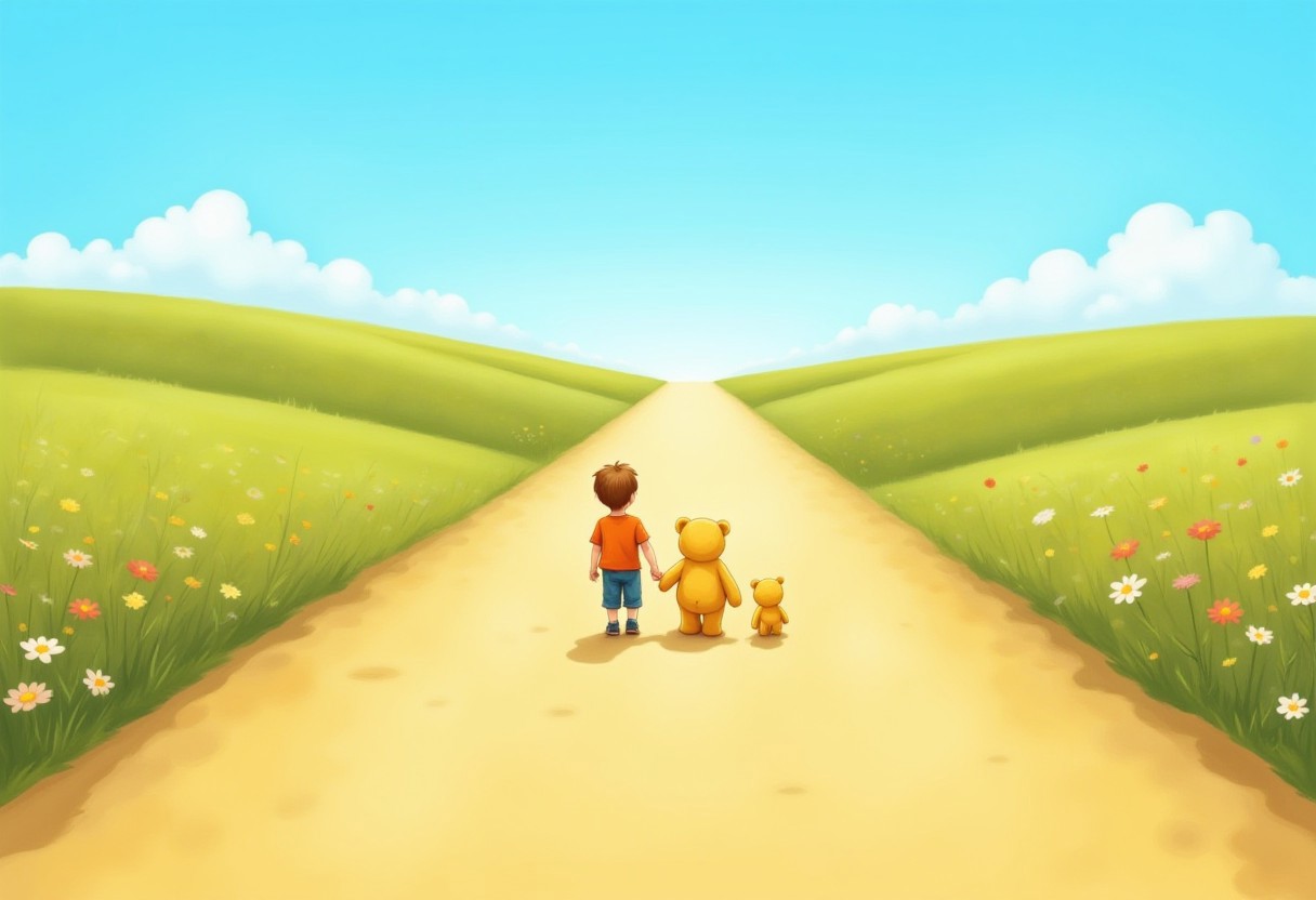 A little boy is walking along a very long road. Next to him is a yellow teddy bear. They are holding hands. The bear is smaller than the boy. The boy and the bear are looking in the same direction, into the distance, with enthusiasm. Along the edges of the road are picturesque meadows, full of flowers of different shapes and colors. The sky is clear, blue and inspiring. The road is yellow, the color of sand. The picture is cute and inspiring for adventures.