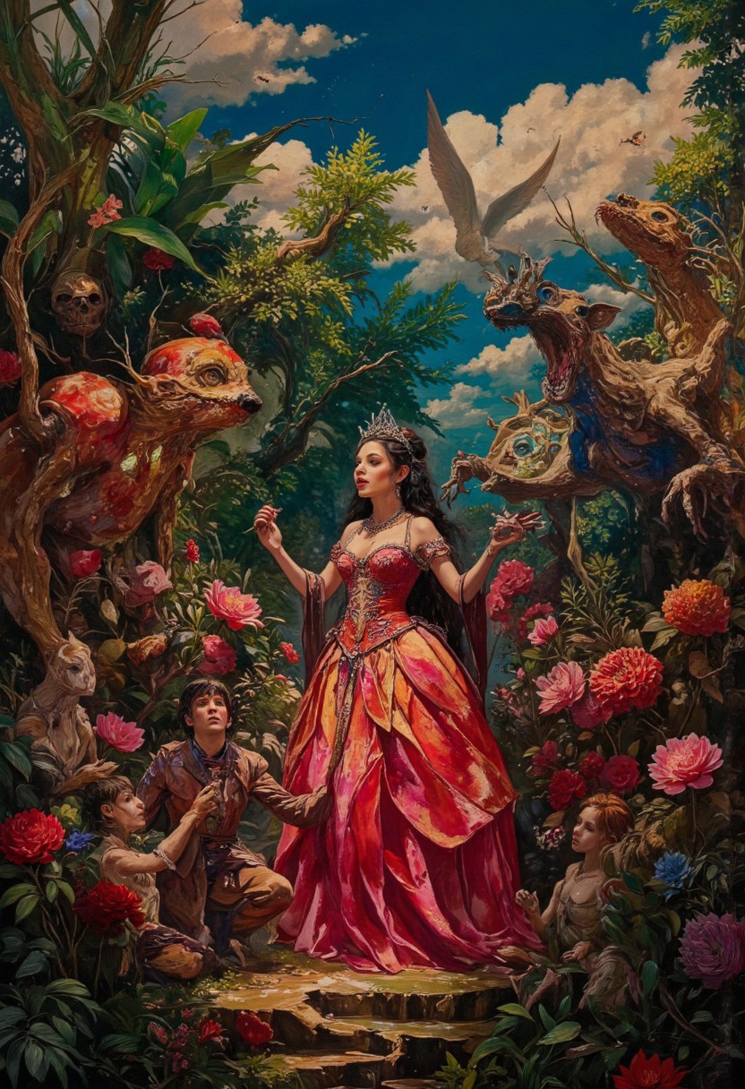 Princess Batcheat sings in a garden filled with flowers that glow with every note she hits. The garden is a kaleidoscope of colors, with plants and creatures that respond to the music by changing hues and shapes. Haroun and the others are enchanted by the surreal, dreamlike performance, in the style of decaying animatronic, claymation, VHS screen grab, grainy, old footage, in the style of an old 80's VHS dark fantasy, VHS screen grab, grainy, old footage