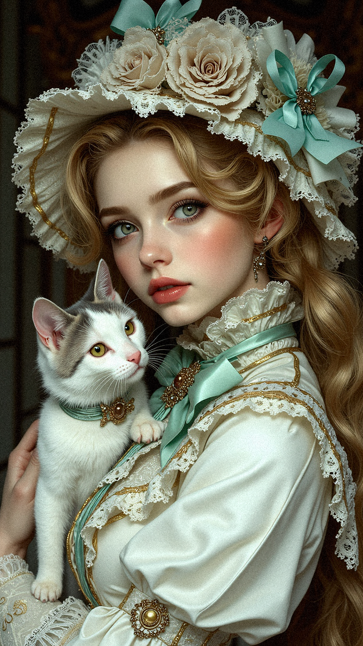 A hyper-realistic portrait of a woman dressed in an elaborate, Victorian-inspired outfit, holding a regal-looking white and gray cat in her arms. Her flowing blonde hair is styled in soft waves, framed by a wide-brimmed bonnet adorned with intricate lace and pastel blue ribbons. Her large, doll-like eyes, shimmering in shades of light blue and brown, exude a captivating elegance, framed by perfectly applied makeup and delicate lashes. Her skin is smooth and luminous, with a soft blush adding warmth to her porcelain-like complexion. The intricate details of her high-collared, ruffled white blouse are complemented by a pastel green and cream bow at her neck, adorned with a vintage brooch. The cat in her arms has pristine fur, its sharp blue eyes reflecting the light with incredible clarity. The ribbons and lace around the cat’s neck match the woman's outfit, adding a sense of harmony to the scene. The background is softly blurred, focusing attention on the intricate textures of her clothing and the lifelike expressions of both the woman and the cat.