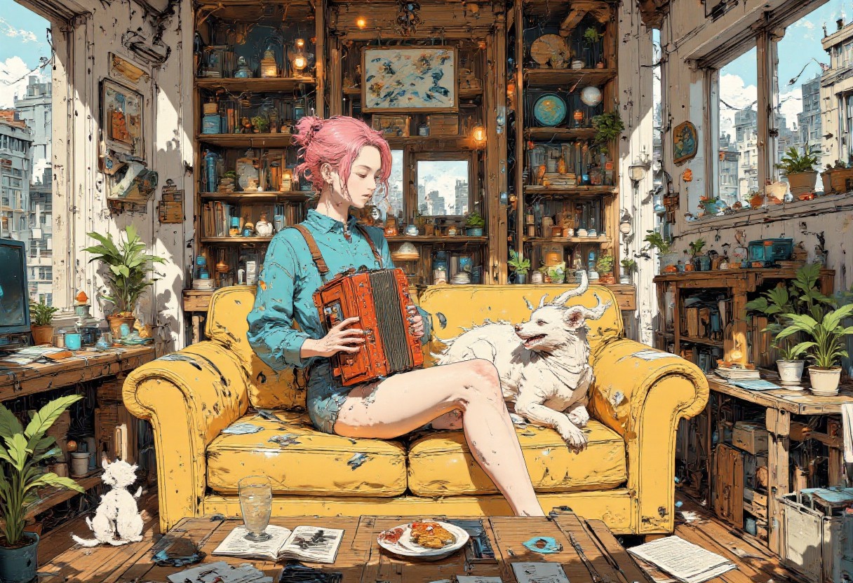 A vibrant and cozy anime-style illustration depicting a young woman sitting on a comfortable yellow sofa in a warmly lit living room. The composition is intimate, capturing a three-quarter view of the woman as she plays a vintage red accordion. Her posture is relaxed yet focused, her gaze slightly tilted, reflecting a serene and contemplative mood. The woman has short, tousled pastel pink hair with soft bangs that frame her face, complementing her pale complexion. Her outfit is casual, consisting of a loose light-blue sweater with a wide neckline, revealing her shoulders, and light denim shorts. The minimalistic attire highlights her relaxed and artistic demeanor. The background showcases a charming and eclectic living space filled with bookshelves, potted plants, and decorative knick-knacks. A small white dragon rests beside her on the sofa, adding warmth and a sense of companionship to the scene. The lower portion of the image includes a coffee table adorned with a cup of tea, a plate of strawberry-topped pastries, scattered notes, and a sketchbook, enhancing the lived-in atmosphere. <lora:Anime v1.3:1.2> <lora:Blue_Future:0.9> <lora:Ethereal_Brush_Anime_v1.0:0.6> <lora:It's a LoRA for portraits, BUT! actually specialized in backgrounds. v1.0:0.2>