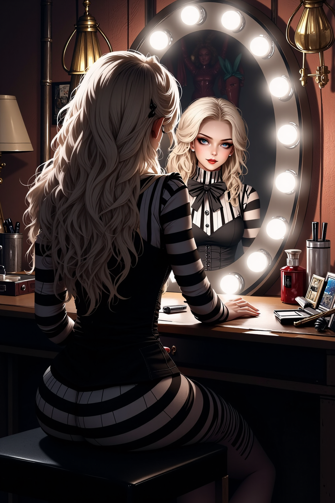 A digital illustration of a back view of a girl sitting in front of a lighted makeup vanity. Her reflection can be visible through the mirror in front of her. The makeup vanity has light bulbs attached around the rim of the mirror, these light bulbs illuminate the room. There are makeup tools and kits on the table. The girl is putting up her makeup. She has a melancholic expression. The girl has wavy platinum blond hair with a with silky smoothness. She has a icy blue eyes. On her eyes she has a dark eyeliner. On her lips she has black lip makeup. She is wearing gothic mime style black and white striped outfit with a corset top and a bow tie. The room is a private dressing room of a circus. There are props, costume, wig and other items that litter around the room.