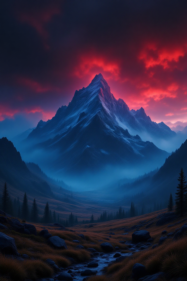 A majestic mountain range rises from the horizon, shrouded in a mystical fog that's infused with hints of indigo and slate. The sky above is a deep, foreboding crimson, as if painted by the brushstrokes of a master artist. The landscape stretches out to infinity, with every rock, tree, and blade of grass rendered in exquisite detail, bathed in the warm glow of cinematic lighting that's equal parts haunting and hypnotic.