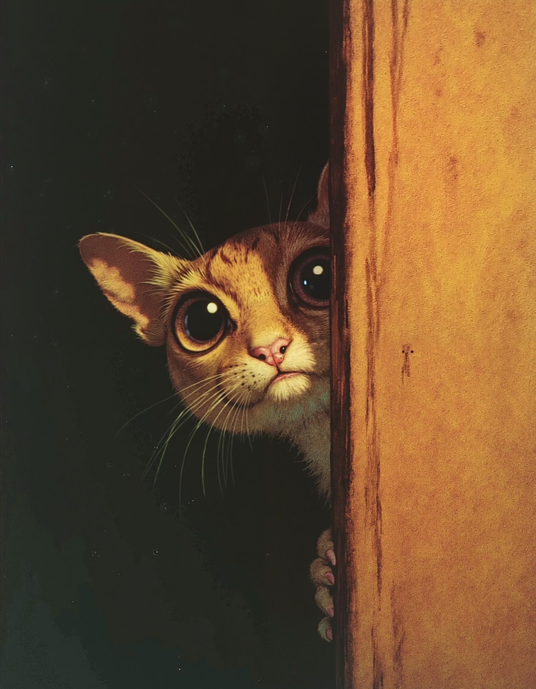 A whimsical creature peeks into the right side of a vertical canvas, its large, curious eyes staring directly into the frame as if observing the viewer. The frame itself appears to bend slightly, reacting to the creatureâs playful presence, creating the illusion that itâs part of the scene, Vibrant Glow In the style of grimmold<lora:Grimmold.safetensors:1.0:1.0>