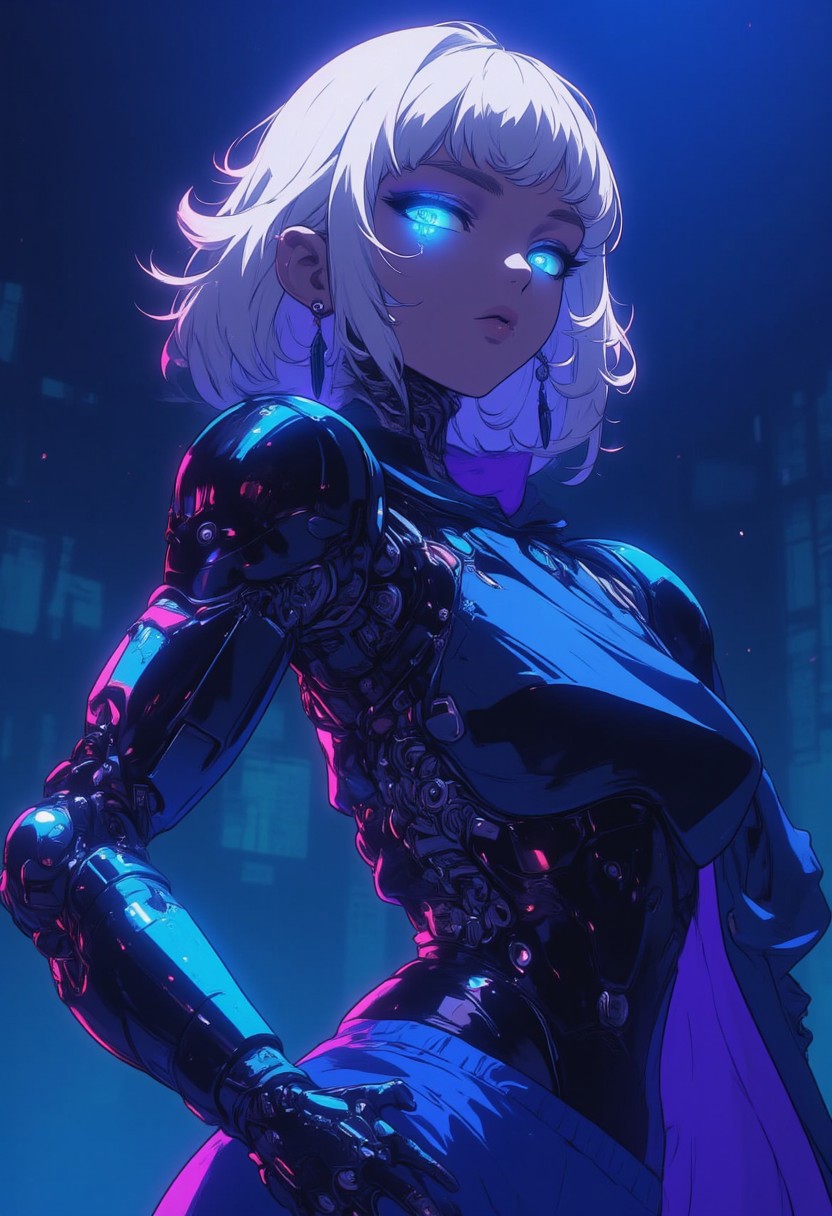 high-resolution, 8k detail, dynamic view, hentai, ultra-detailed, ((masterpiece), (best quality), (ultra-detailed), illustration, unreal engine 5, unreal engine 3d scene), HD, details, high quality, rendered face, anime, good_hands. hourglass figure, perfect body, Chromecore, highly detailed, sharp, masterpiece, intricate details, a sexy robot girl, simple background, dark and blue background, vibrant colors, colorful, metal skin, expressionless, serious, chromecore, bright, dark vibes, dark fantasy, armor, monochrome, colored skin, gradient BREAK medium hair, earrings, cloak ,cape, jewelry, blue shorts, boots, BREAK soft skin, soft skin, shining glossy skin, soft abs, slim waist, (slender body), Expressiveh, (volumetric lighting:1.2), cinematic, cinematic lighting, reflections, ultra hd, visual effects, graphic effects, ambient occlusion, raytracing, soft lighting, realistic, blum effect, masterpiece, absolutely eye-catching, particles, glow, shining, intricate cinematic background, (beautiful face), BREAK (Masterpiece), (expressive eyes), 1girl, Automaton, colored skin, (white_skin:2.0), (joints:2.0), white hair, blue eyes, glowing blue eyes, side view, looking at viewer, waist up, large mechanical breasts,