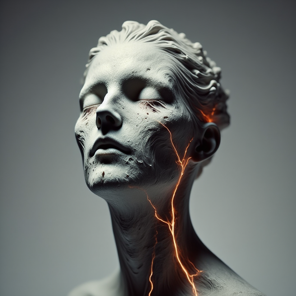 high quality, high detail, high resolution, (marble statue:1.1), simple grey background, transparency, subsurface scattering, cracks, orange glow, realistic, cucoloris patterned illumination, glowing, sparks, lightning