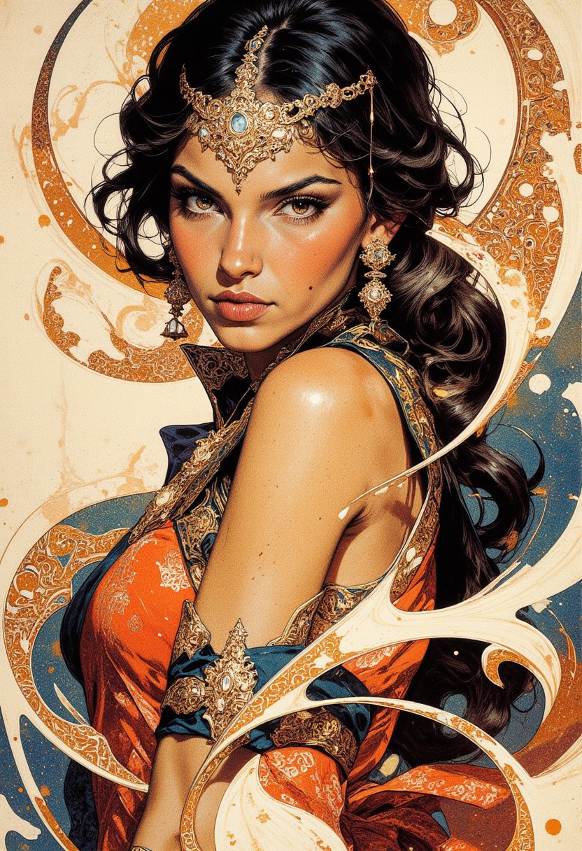 A traditional Indian ink-on-paper masterpiece blending the essence of Mughal Opulence with a sensual, surreal allure. The artwork depicts an enigmatic, erotic yet divine Indian goddess, her delicate face framed by cascading black hair, adorned with intricate temple jewelry and soft, ornate braids. Her mesmerizing almond-shaped eyes, set with a radiant shade of amber, glow gently, contrasting with her golden-hued skin as she gazes provocatively at the viewer. The inkwork swirls in rich shades of ochre and maroon, flowing harmoniously across the composition. She wears a traditional saree, its luxurious fabric slipping from her shoulders to reveal a tantalizing glimpse of her neckline and cleavage. Abstract swirls of henna-inspired patterns, reminiscent of intricate mehndi designs, curve and twist around her form, imparting a sense of fluid, ethereal movement. The ink composition comes alive with surreal splashes of deep vermilion, soft ivory, and smoky indigo, enhancing the imagery while embracing the beauty of imperfections. This goddess exudes an intoxicating mix of mysticism and eroticism, seamlessly blending Indian beauty with surreal, otherworldly grace.