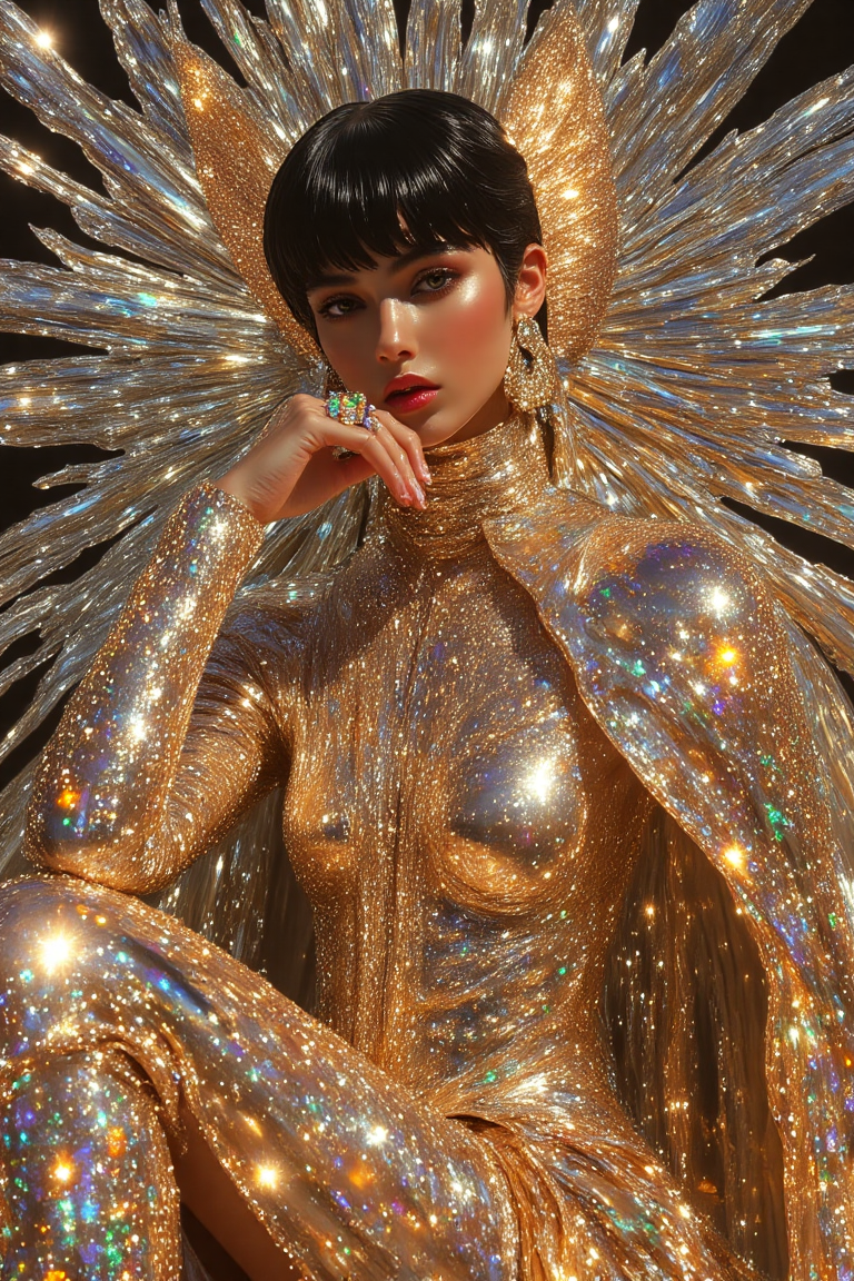 A mid-shot fashion editorial of a woman with short, jet-black hair styled into a textured pixie cut with a wet-look finish. She wears a golden, shimmering draped gown by Balmain, designed by Olivier Rousteing, featuring bold geometric embellishments and a structured neckline. Accessories include studded ankle boots, a fringed cape, a metallic corset belt, leather wrist cuffs, and a gold-embossed clutch. Jewelry includes layered gold chains, oversized hoop earrings, a delicate anklet, stacked rings with emerald stones, and a chunky gold bracelet. The headpiece is a sharp, wing-like design made of golden feathers. Her dynamic pose features a slight forward lean with one arm resting elegantly on her shoulder and her gaze piercing the camera. The background element is a chrome, irregularly shaped sharp silver grill, shimmering with sparkling effects.