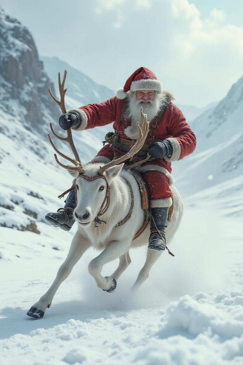 Santa Claus, middle-aged, Caucasian, rides a large, white reindeer, through a snowy mountain landscape. The reindeer and Santa are in mid-gallop, with the reindeer exhibiting intensity, almost aggressive energy. Santa wears a traditional red Santa suit, complete with a matching red Santa hat, and a thick white beard. His expression is focused and determined. The reindeer is a light cream/off-white color with noticeable detail in its fur and hooves, and sturdy-looking leather straps and tacks adorn the reindeer. The environment is a snowy mountain pass, with a blizzard impacting the scene; the flying snow powerfully fills the air around them. A harsh, icy, winter wonderland style dominates with white and deep gray, cool tones, and the focus is on action and motion. The artist style is realistic, but with a heightened sense of drama and speed. High-action perspective, emphasizing Santa's strong figure and the reindeer's powerful movement. <lora:Flux.1_Turbo_Detailer:1> <lora:flux_realism_lora:1> <lora:lora:1>