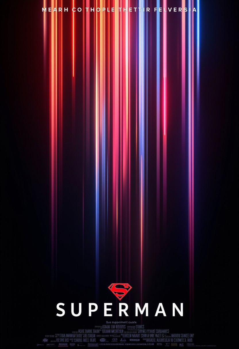 This image is a digital poster for the movie "Superman." The poster features a dramatic, high-contrast vibrant vertical motion lines made of mix of colors, including reds, blues, and purples, creating a dynamic and energetic atmosphere. The colors blend together, creating a sense of motion and depth. The text on the poster is white and bold, with the word "SUPERMAN" prominently displayed at the bottom. The release date and theater information are also included in white text. The overall style is modern and cinematic, with a focus on creating a visually striking and immersive experience. The poster utilizes a blend of digital effects and photography to create a visually dynamic and compelling image.