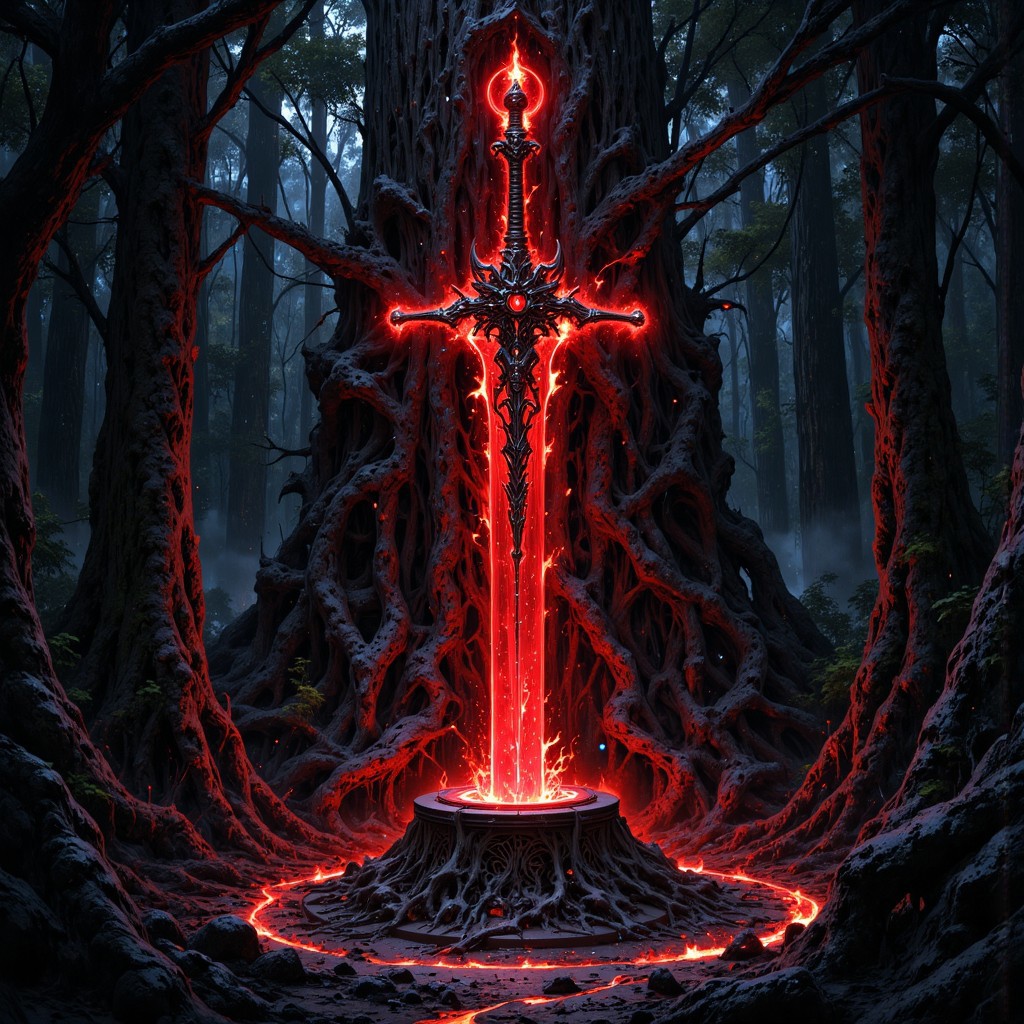 A red glowing fantasy sword curse altar is lost in a dense and dark forest. The curse sword altar is glowing in a dense and dark athmosphere, surrounded bay giant dark trees of the forest. The illustration is very detailed with intricate details and in a realistic fantasy oiled painting style.