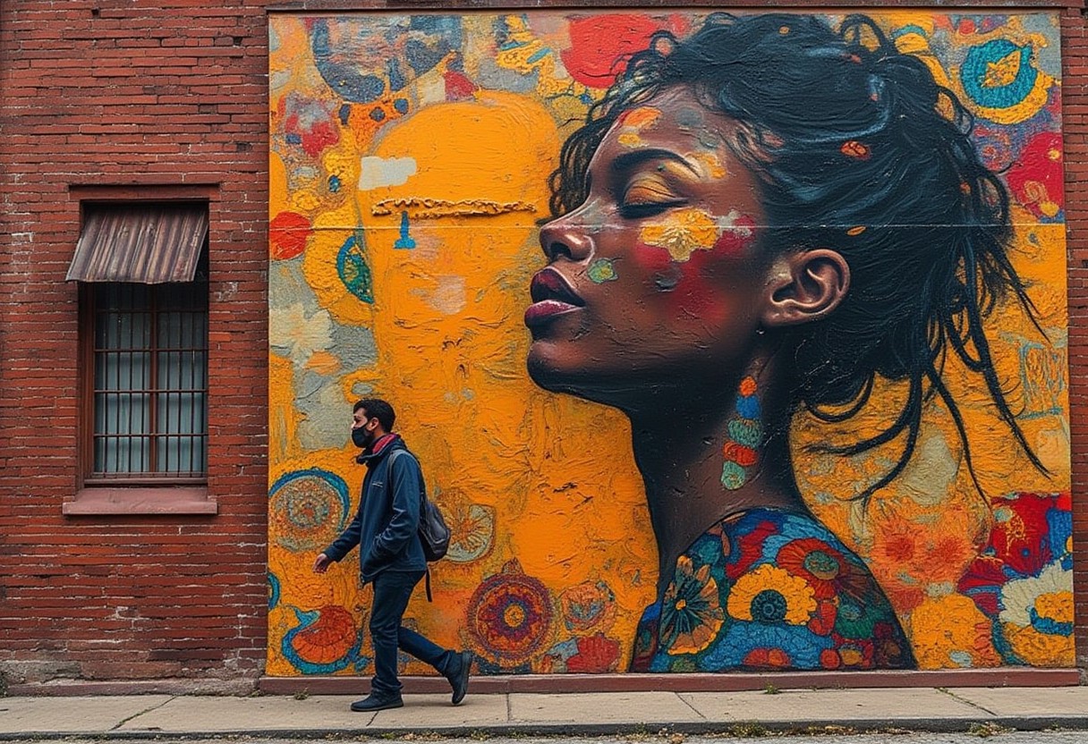 Street-Artji, Street art infused with a (sense of wonder:0.6) portraying a person walking past a mural on the side of a church, by Nōami, mural by Joshua Mays of afrofuturist black women singing, eyes closed, passionate, intricate, a person standing in front of art, outside (rough details, (female focus:1.5):1.2) (hyperdetailed, absurdres:1.15) The diffused lighting softly illuminates every detail, HD, 8K quality, ultra-detailed, masterpiece artwork, flawless anatomy.