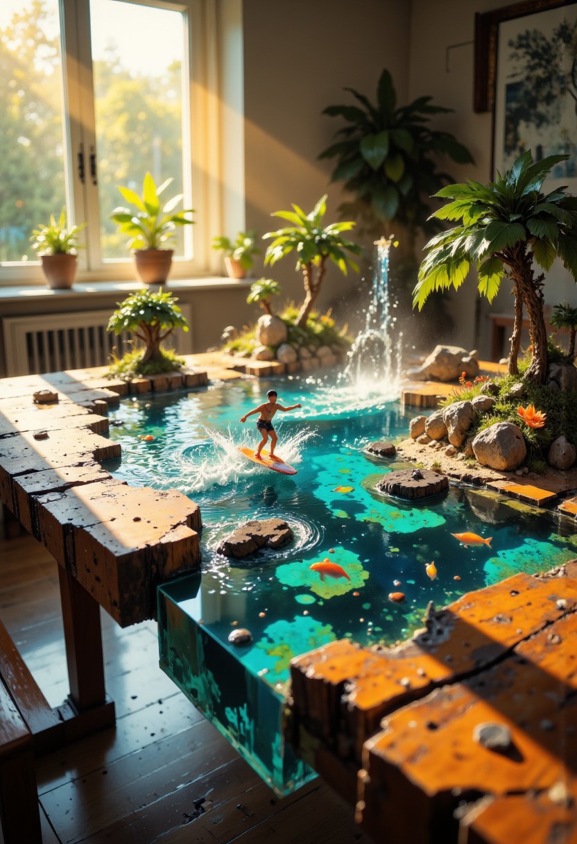 Capture a macro scene of an intricate epoxy river table brought to life with vivid details and dynamic interactions. At the center of the composition, two miniature surfers ride translucent epoxy waves that ripple with refracted light, their vibrant boards cutting through glistening surf. Surrounding them, miniature palm trees and beach vegetation adorn the wooden edges of the table, their tiny leaves casting soft shadows onto the polished surface. Beneath the epoxy river, small aquatic life like vibrant fish and coral formations create an underwater world teeming with energy. The table's natural wood grain remains visible on one side, providing a striking contrast to the glossy resin. The camera focuses tightly on the central surfer with a tilt-shift blur effect, creating a cinematic depth of field that highlights the fine details of the scene. In the background, a lush bokeh effect softens the edges of the room, blending warm natural light with scattered glints reflected off the epoxy surface. Rays of sunlight streaming through a nearby window enhance the vibrant colors and amplify the scene’s lifelike atmosphere, offering a harmonious blend of craftsmanship and imaginative storytelling.