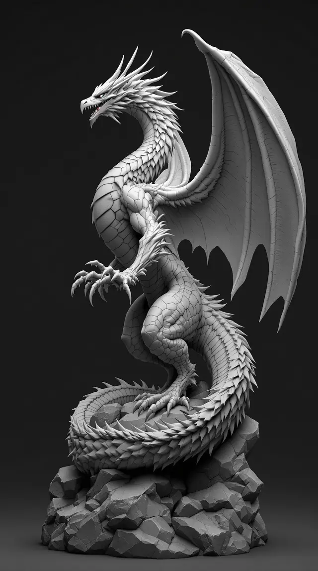 A majestic, stylized, mythical creature, rendered in grayscale, with intricate details. The creature, possessing both dragon and avian features, is positioned in a dynamic, poised stance, wings outstretched, claws extended. Sharp, angular features define the head, with a powerful, almost predatory expression. Its body is a mix of smooth curves and sharp edges, showcasing an interplay of light and shadow that accentuates its musculature. The dragon-like tail snakes around a rocky base, creating a sense of power and grounding. The rock base is detailed with cracks and crevices. The grayscale palette creates a dramatic and otherworldly mood. The lighting emphasizes the form and texture, creating a sense of depth and volume. The overall style is high detail, professional, and inspired by fantasy sculpture. The perspective is a three-quarter view, showcasing the creature from the rear and side. Precise anatomical accuracy is evident, with subtle differences defining the creature; …