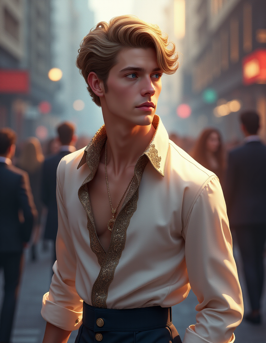 1boy, male, In the vibrant heart of a bustling city, Nikola's beauty captivates all who cross his path, a stunning blend of his Russian and British ancestry.His porcelain skin glistens like freshly fallen snow, smooth and luminous, while His delicate features are accentuated by high cheekbones and a perfectly sculpted nose, giving him an ethereal grace reminiscent of a timeless portrait. His striking blue eyes, deep and mesmerizing like the vast ocean, sparkle with intelligence, drawing people in At an elegant 5'10", He carries herself with an innate regal elegance, his slender frame poised and graceful. His figure, accentuated by full, firm pectorals and elegantly shaped hips, embodies both Masculinity and strength. Dressed in lavish shirt and silk pants made from sumptuous silk and adorned with intricate beadwork, his fashion sense speaks volumes about his refined tastes and royal heritag, the fabric shimmering in the soft light, highlighting his every movement with an enchanting fluidity.