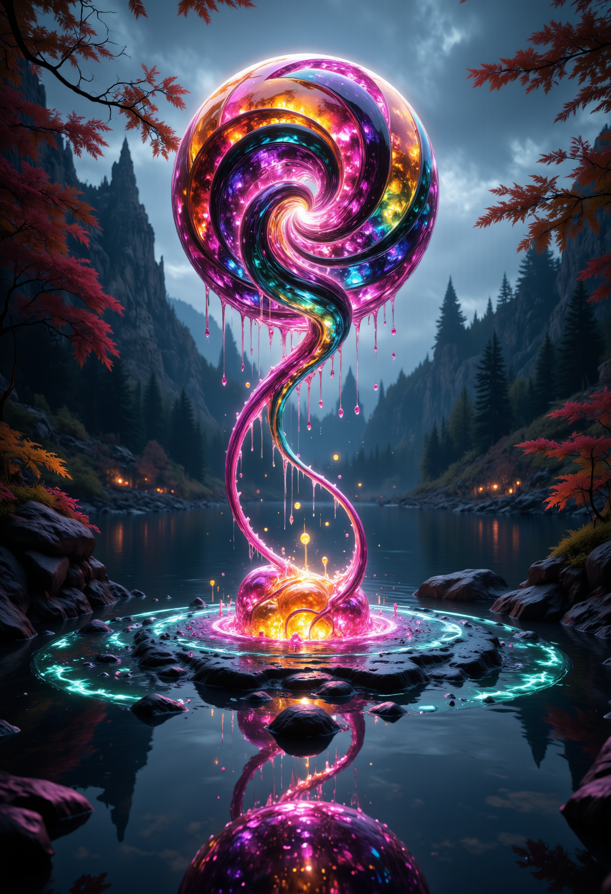 a still mysterious lake, colorful autumn forest background, overcast sky, a bright brilliant and eerie light emits from the bottom of the lake, a spiraling helix of multiple water tendrils rises up twisting out of the water, It reaches like ribbons for a large colorful glowing gemstone sphere that is levitating above the lake, mist, highly detailed and cinematic, aidmasoftglow , aidmaMJ6.1, aidmaHyperrealism<lora:MysticFantasydetailer:0.6> <lora:aidmaSoftGlow:0.8> <lora:aidmaHyperrealismv0.3:0.4> <lora:aidmaMJ6.1v0.4:0.4>