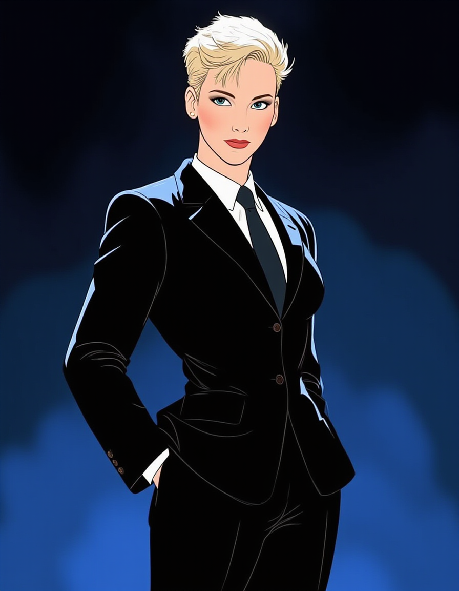 Disney anime, Disney Morph, Disney Style, (2D Animation), in the style of cksc, a digital drawing A mature woman in a tight office matte velvet suit . Stylish haircut, short blonde hair. action pose, dynamic pose, dominant,arrogant facial expression, The background is minimalist, a gradient of shadowy blue tones. The overall composition feels cinematic.., , . masterpiece, best quality, medium-format camera, high-contrast, dramatic lighting, striking composition, CPA. Alexis