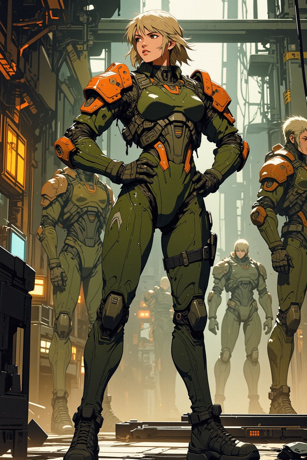 A graceful and strong female warrior, in a tight-fitting green tech suit with orange accents showing her wide hips, she have armored shoulder pads and standing collar around her neck. On her chest she have modular chestrig. She have a military black boots. She is standing, arched back, holding her hands on hips, looking back and head is directed slightly to one side. She have a short blonde hair with banks, gray eyes, a hooked nose, and a hip holster. A large dirty and detailed hi-tech manufacturing workshop and mechanical exosuits are blurred in the background. Exosuits have no round shapes, they are boxy, human like design and they are heavy armored. volumetric lights, otherworldly atmosphere, light fog