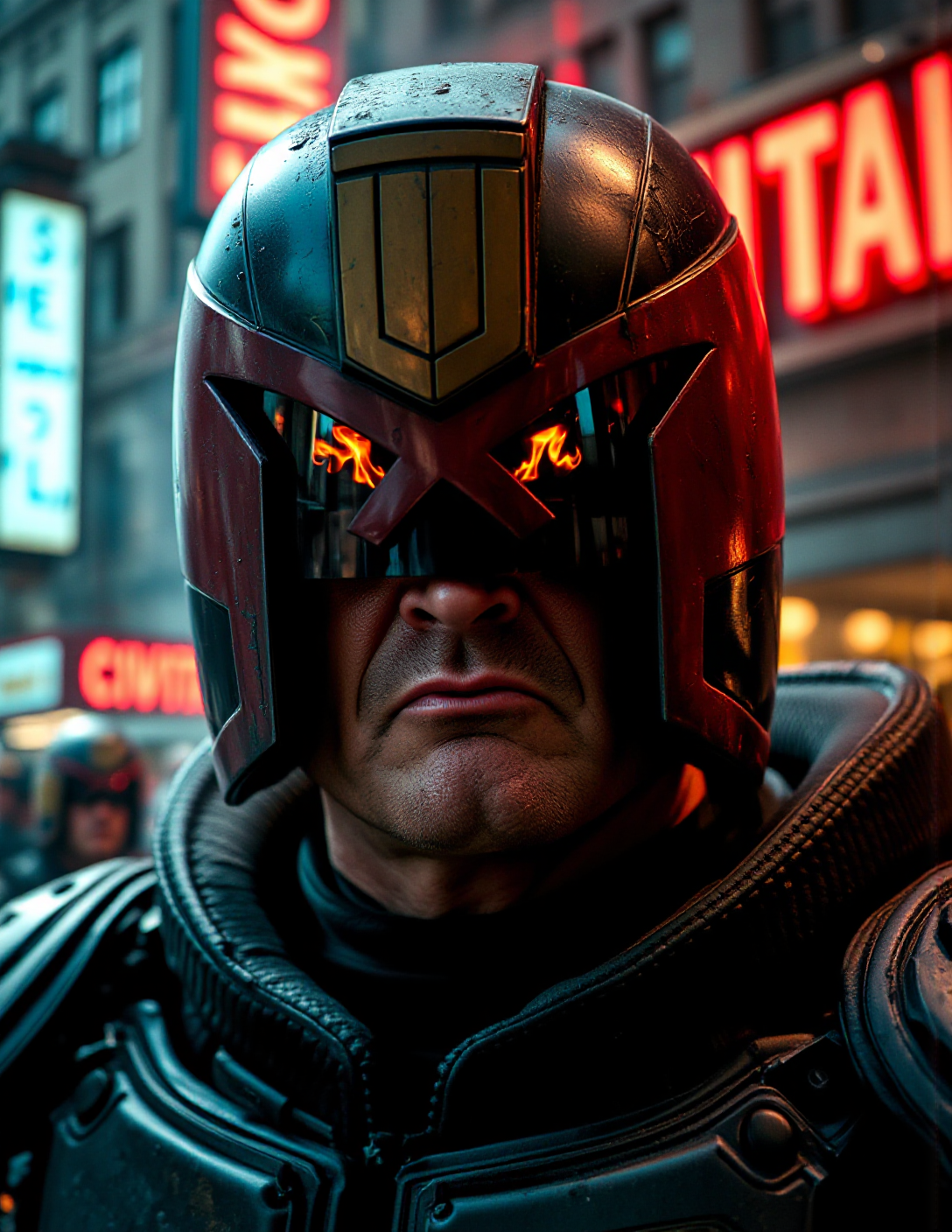 A close-up portrait of Judge Dredd, his face partially shadowed under the iconic black helmet adorned with a golden eagle crest. The reflective glass of his visor captures flames. His jaw is clenched, his mouth twisted in a scowl that speaks of unyielding authority and grim resolve. The textures of his armor are gritty and battle-worn, glistening with the sheen of sweat and dust under the muted, flickering light of burning neon signs. The background blurs into indistinct mayhem, drawing all focus to his intense, unforgiving expression. In the background a neon sign on a building reads "CIVITAI"