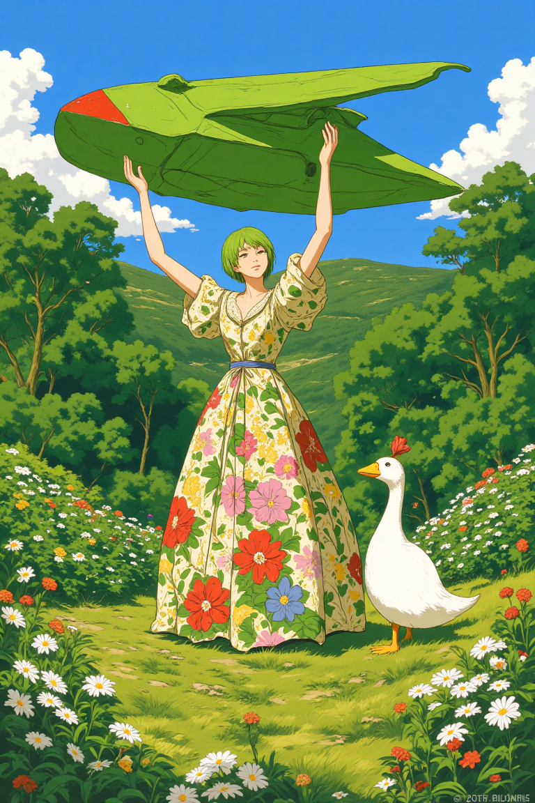 A whimsical, vibrant digital painting showcases a lush, green landscape where a woman and a white duck create a cheerful focal point. The woman stands center stage, facing slightly to the right, her arms extended upward as she holds a large green paper airplane above her head. Her short, bright green hair contrasts playfully with her flowing, Victorian-inspired dress, adorned with vivid floral patterns in red, pink, yellow, and blue. The dress, with its high waist and full skirt, adds elegance to the scene’s playful energy. To her right, a white duck with a small red flower perched on its head stands calmly on the grass, its head tilted inquisitively. The background is alive with rolling hills, lush green foliage, and scattered white flowers, creating depth and serenity. A clear, bright blue sky frames the scene, amplifying the cheerful atmosphere. Rendered in a highly stylized, cartoonish manner, the artwork features bold, polished colors and clean, smooth lines, evoking a surreal yet harmonious blend of charm and joy.
