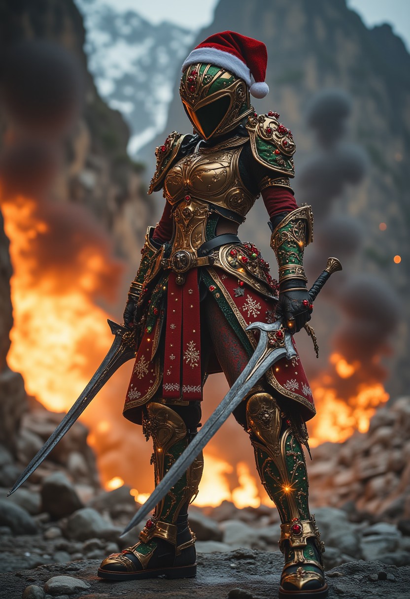 female armor warrior wielding a pair of sword, standing in a fighting stance. she is lost in space, background is blurred with depth of field effect. her armor is christmas theme and filled with lights. explosions in the background