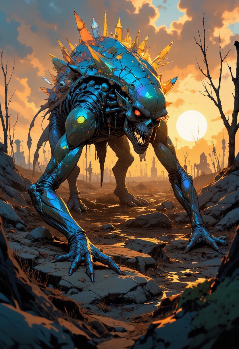 A grotesquely beautiful Lovecraftian paranormal crystal crawler crawls over a barren landscape, its shimmering appendages casting eerie shadows in the golden hour light. This scene is captured in a surreal photograph, showcasing the immense detail and vibrant colors of the otherworldly creature. Its crystalline body reflects the dying light of the sun, creating a mesmerizing display of iridescent hues. The intricate patterns on its alien skin seem to shift and change, drawing viewers into a mesmerizing and hauntingly beautiful image.