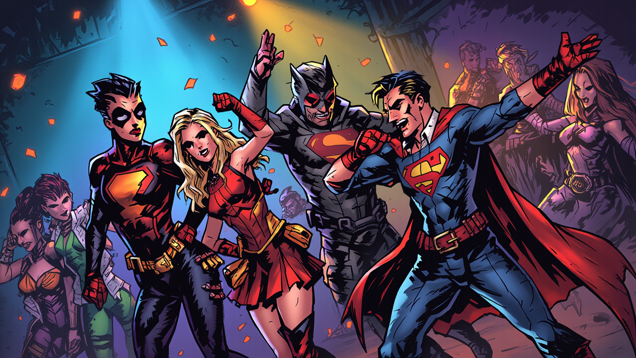 inked comic illustration in dd artstyle, a halloween party inside a large dance hall with various people in their 20s with dark empty black eyes dressed in various superhero halloween costumes